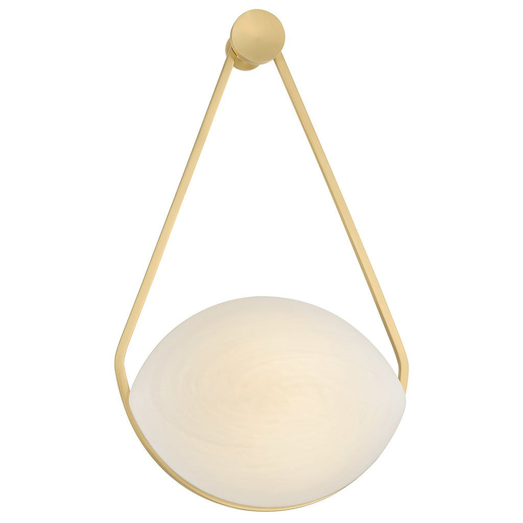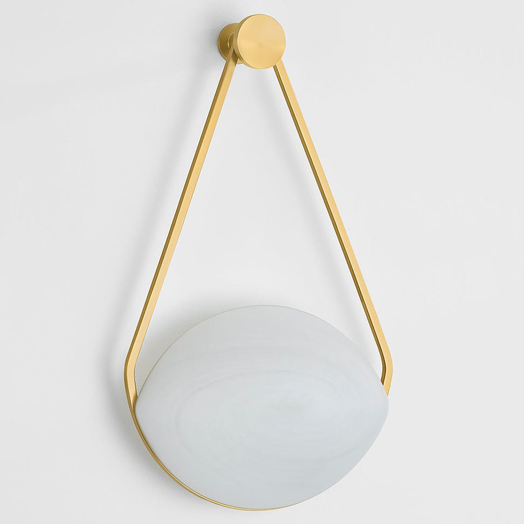 Inspired by the elegance of a drop earring, the ethereal Hudson Valley Lighting Blaina sconce features a soft oval-shaped shade supported by an artistic triangular suspension. The swirls of the matte cloud glass shade are complemented by the warmth of the Aged Brass frame, highlighting a sense of cohesion between the materials. Dangling from a peg-like mount, Blaina makes a poetic statement.
