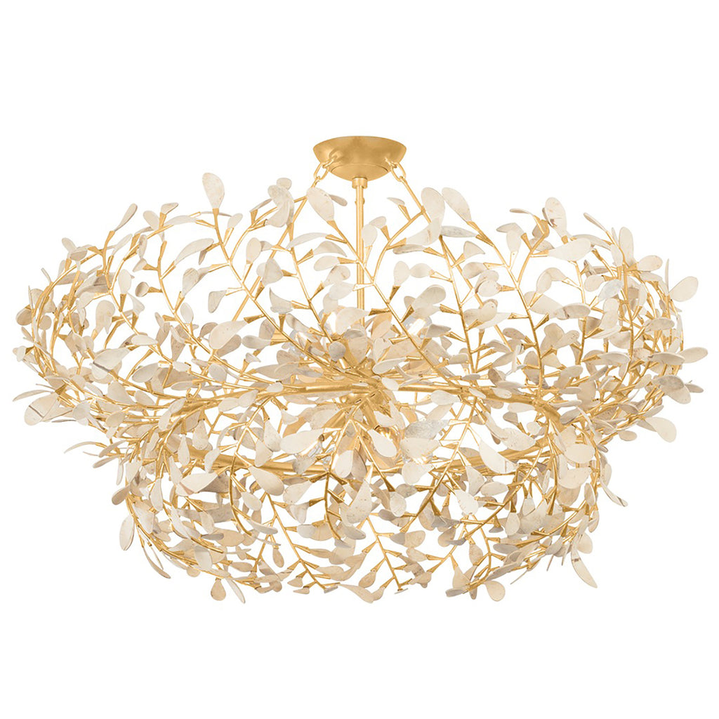 Graceful, scrolling ‘vines’ with delicate coco shell ‘petals’ wisp around to create the nest-like silhouettes of the Maybrook family. The organic beauty of the carved coco shell is paired with a Vintage Gold Leaf finish in this glamorous ode to nature. Whether as a sconce, semi-flush mount, or chandelier in two sizes, Maybrook’s silhouette is voluminous and radiant, creating an enchanting focal point.