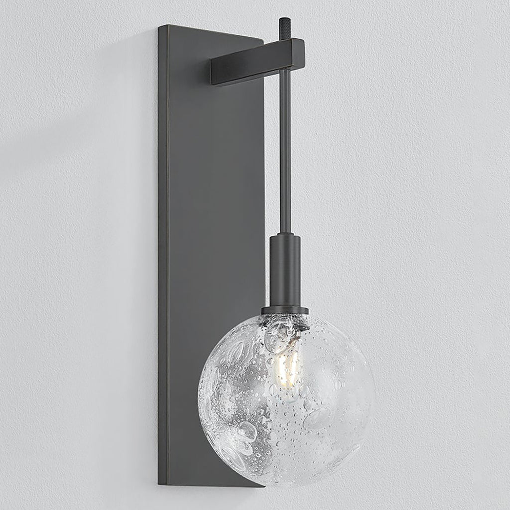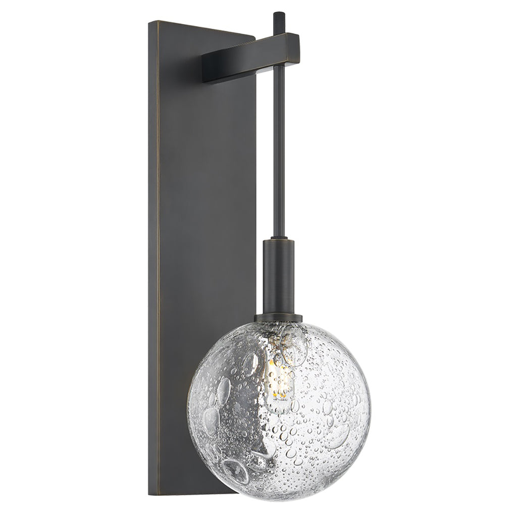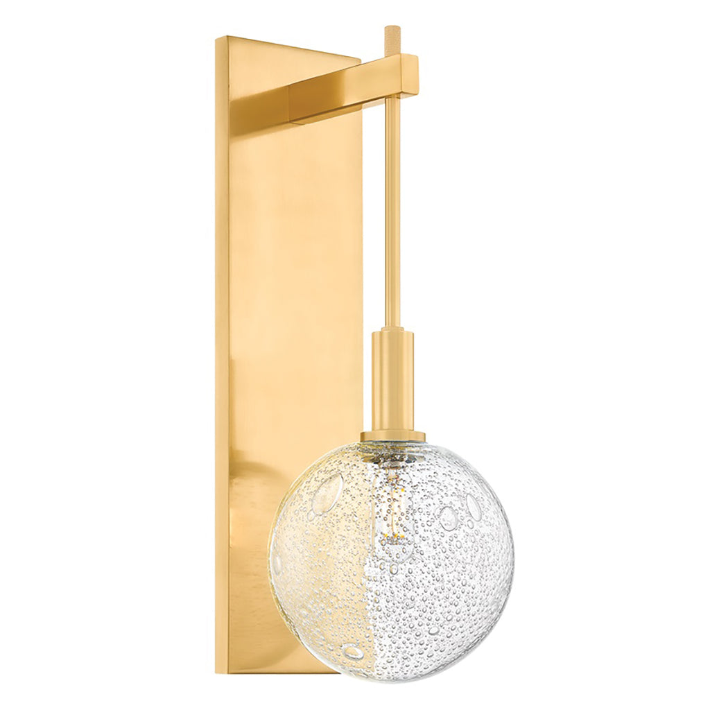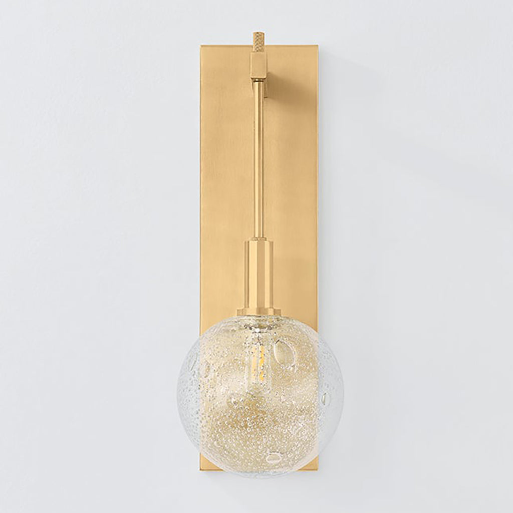 Drawing inspiration from a clock pendulum, the artful silhouette of Hudson Valley Lighting Onteora makes a striking statement on the wall. The verticality and sleek forms call attention to the finer details, from the ornate seedy glass to the extended stem. This one-light sconce is available in a luxe Aged Brass finish or an industrial Distressed Bronze finish.