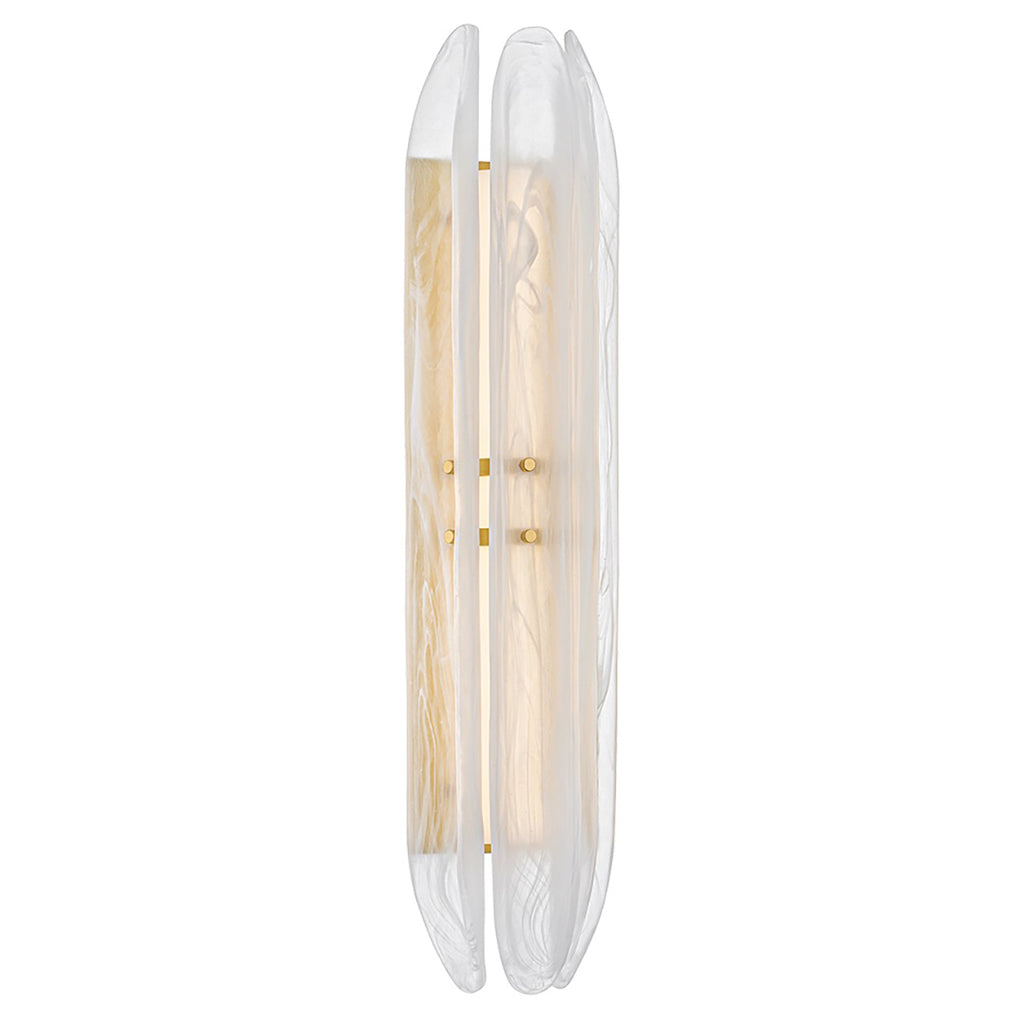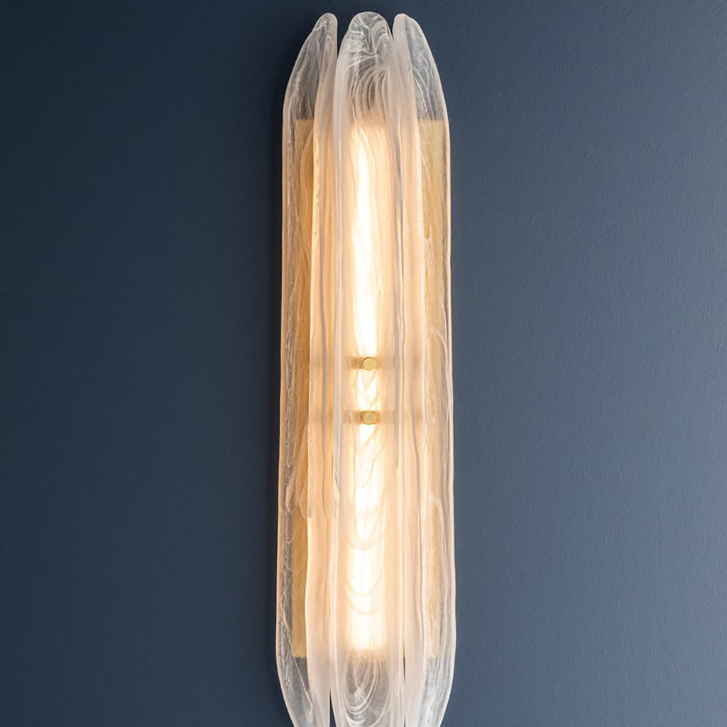 Elevating a minimalist silhouette, the Hudson Valley Lighting Westtown sconce uses exquisite materiality to create a subtle statement. Secured with small Aged Brass thumbscrews, long pieces of piastre glass are positioned before an LED light source. Internally etched with a white swirl pattern, the glass creates a soft light diffusion, perfect for a hallway or bathroom.
