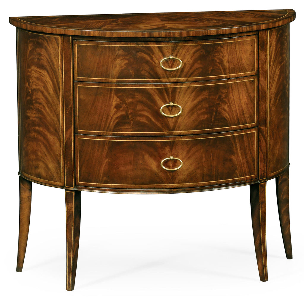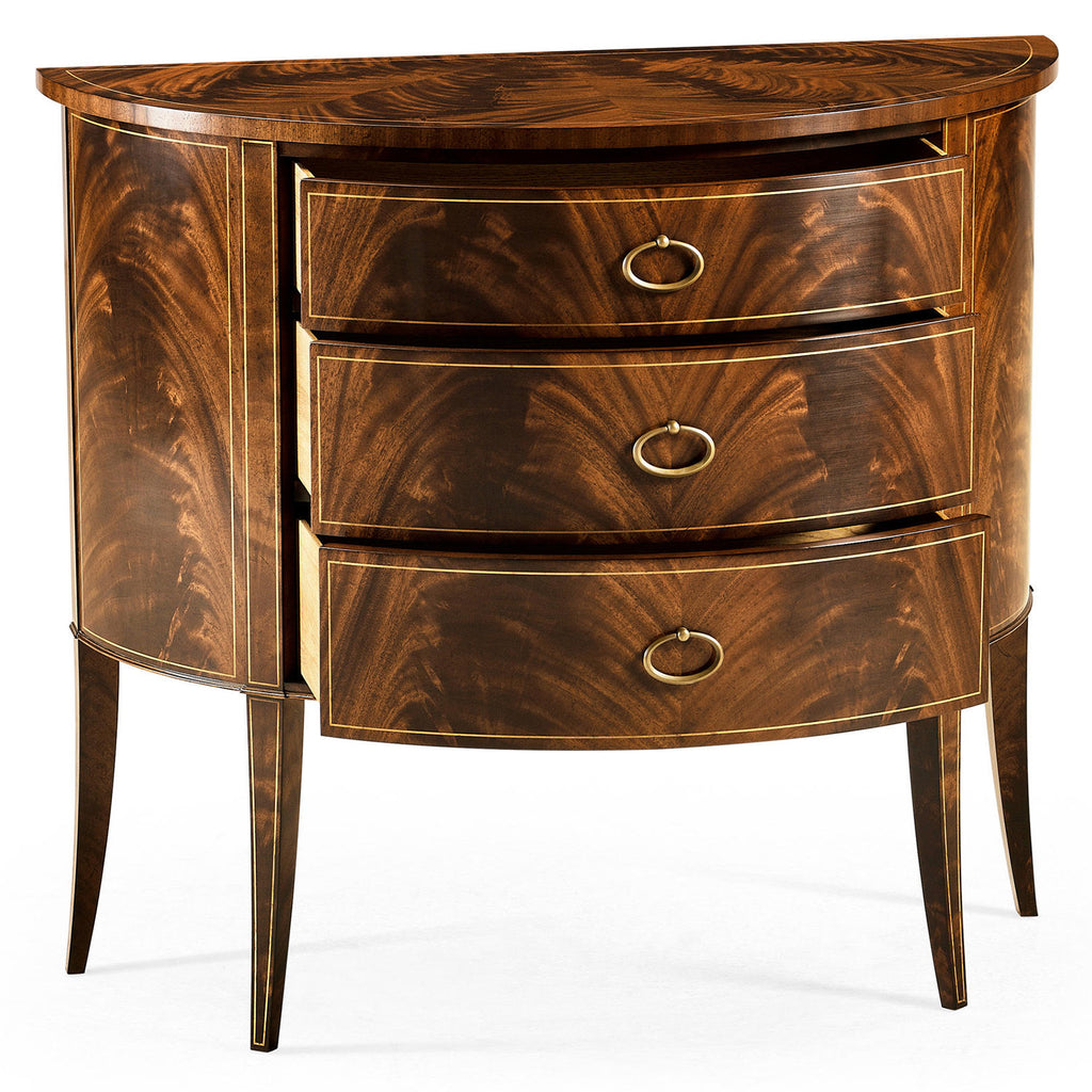Elegant Biedermeier inspired demilune chest of three drawers veneered in crotch mahogany with contrasting stringing inlay raised on tapering sweeping legs with matching inlays.