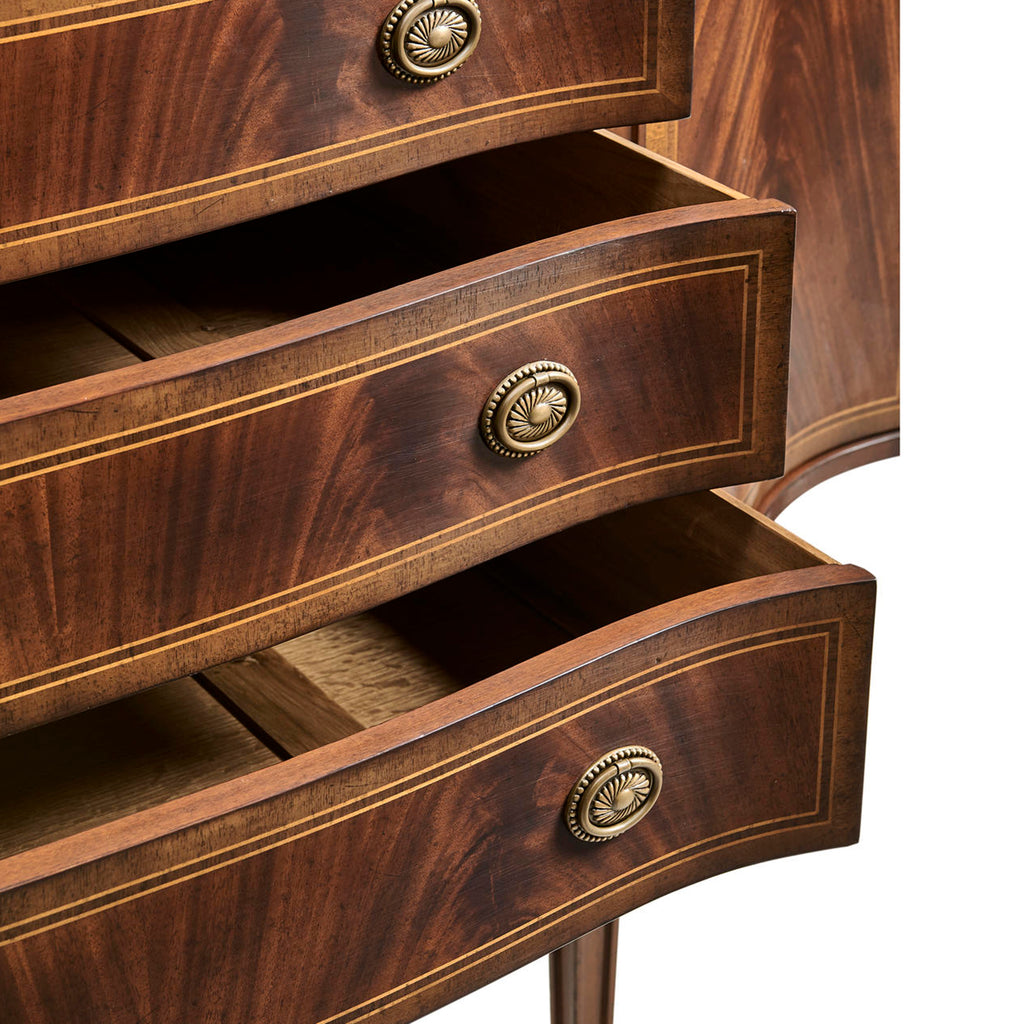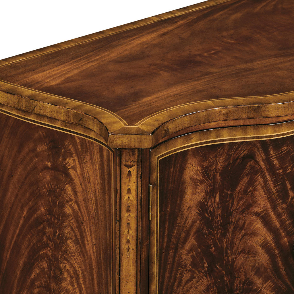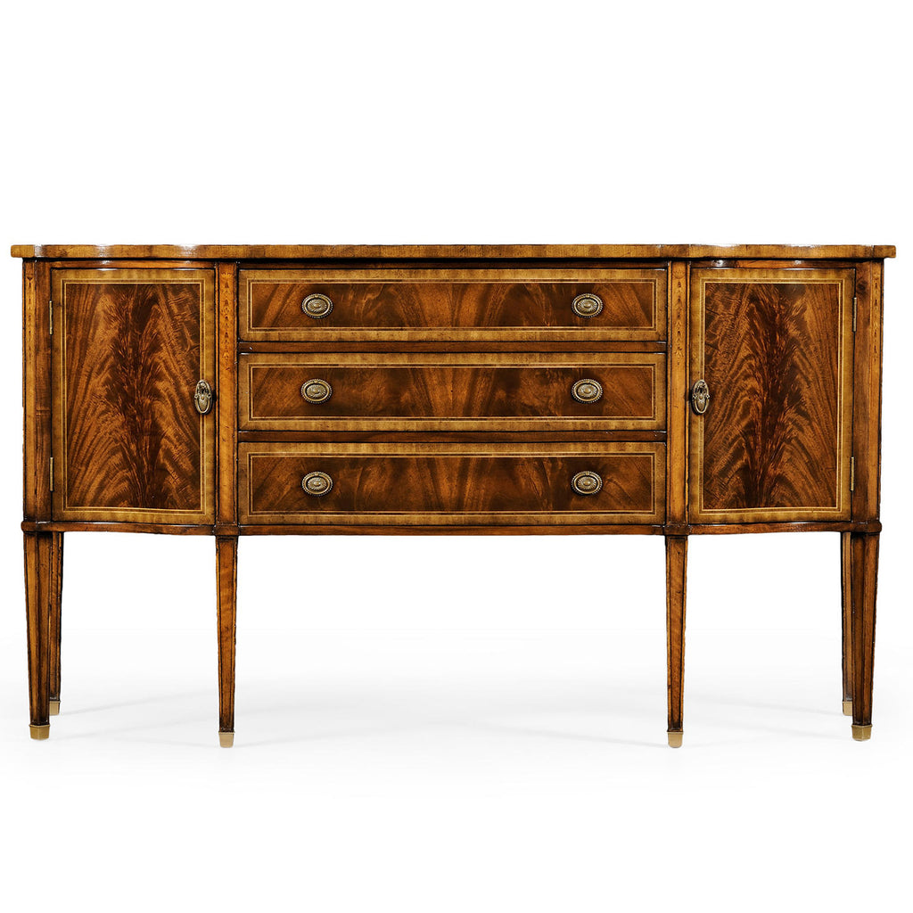 Regency style crotch mahogany veneered sideboard the breakfront with concave doors to either end, and with three drawers to the center. Patinated brass oval handles, fine marquetry detail to the paneled tapered legs and set on brass feet with square cross section.
