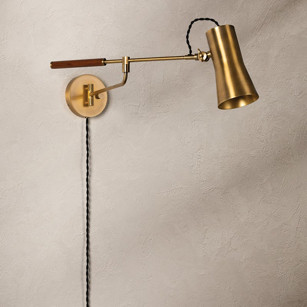 Tailored task lighting, this portable, functional swing arm sconce is also thoughtfully designed and beautiful. The sleek arm features a wooden handle on one end and an adjustable metal shade in Patina Brass or Bronze on the other. The twisted black cord detailing at the shade and backplate give Novel a nostalgic feel. Part of our Lauren Liess collection.