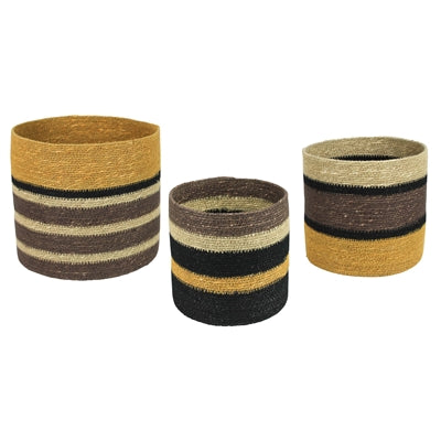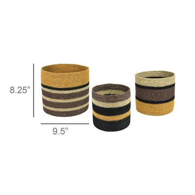 This set of 3 earth-hued seagrass woven baskets are stitched with cotton to offer understated shapes and sizes designs to add style and function to the home. Organize clutter in the home and with use of a liner this makes an amazing vessel for houseplants.