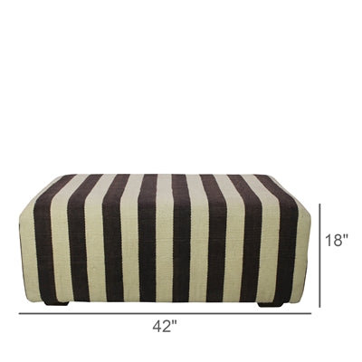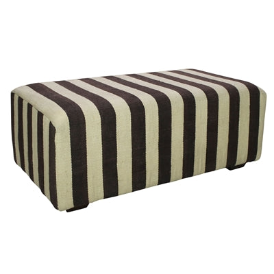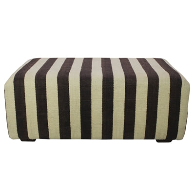 A striped kilm woven of jute and cotton covers this statement ottoman, the perfect spot for extra seating or add a tray and it's an instant coffee table. Mango wood feet.
