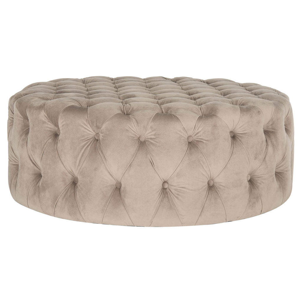 Brimming with sophistication, the elegant cocktail ottoman recalls the 1930s Hollywood glamour with its lavish taupe linen fabric button-tufted on all sides. The oversized round shape and foam fill create a wonderful surface for use as a coffee table or extra seating.