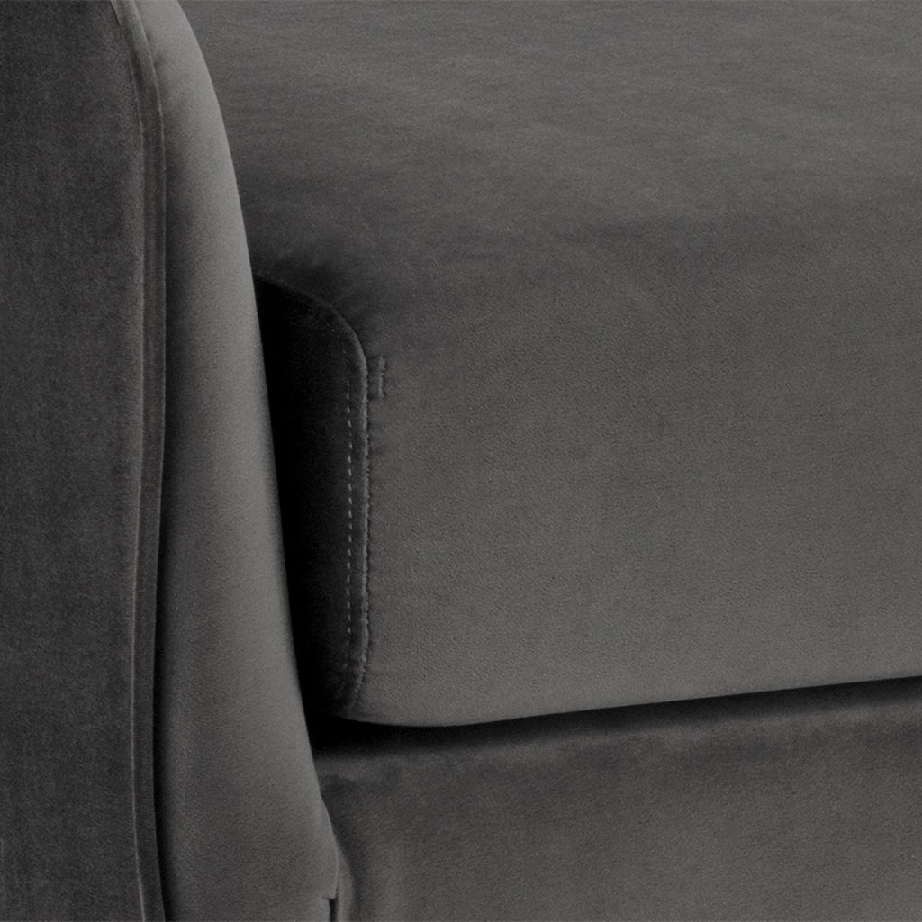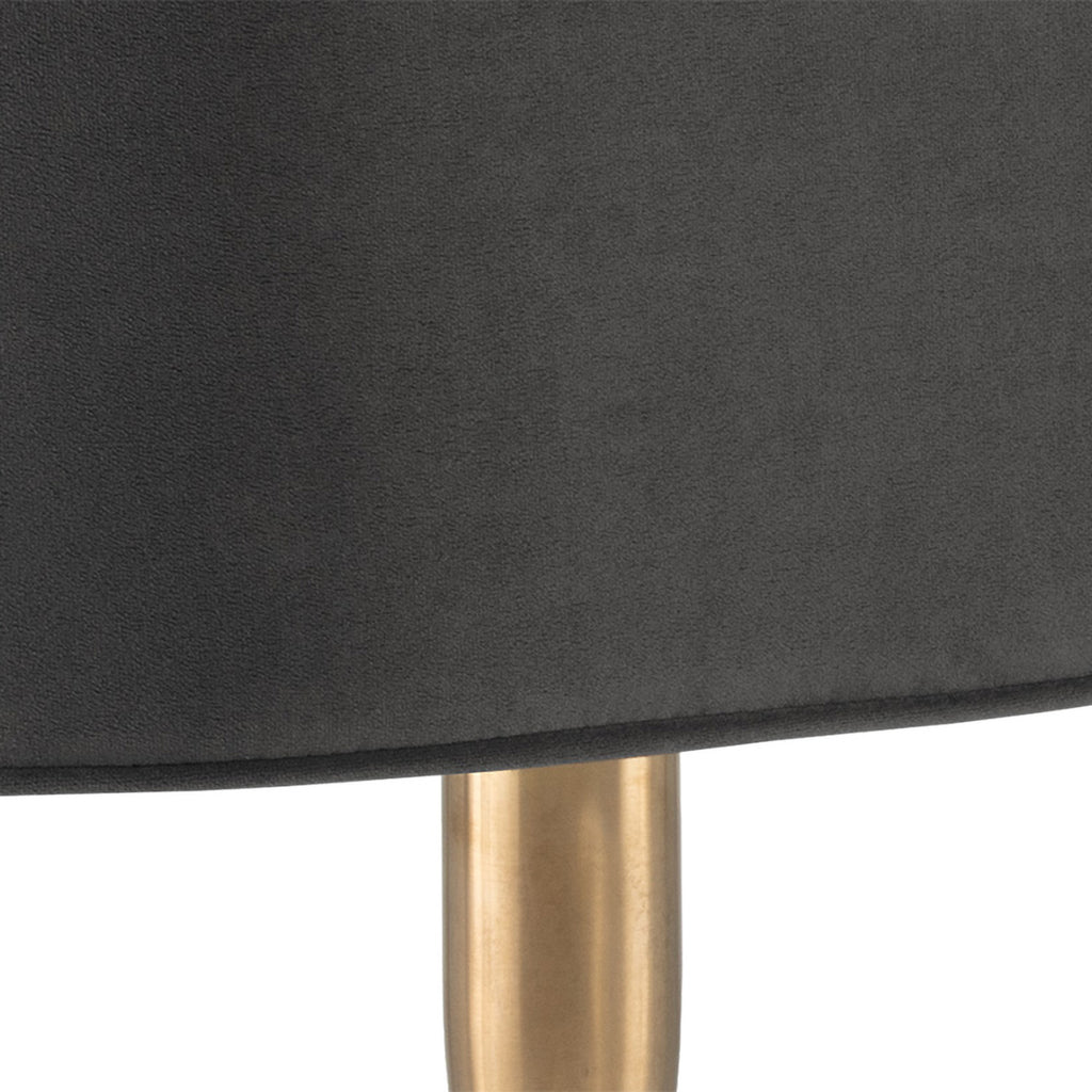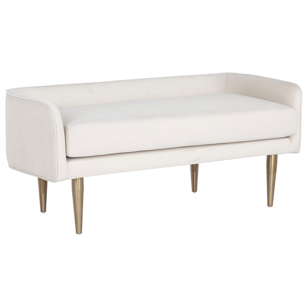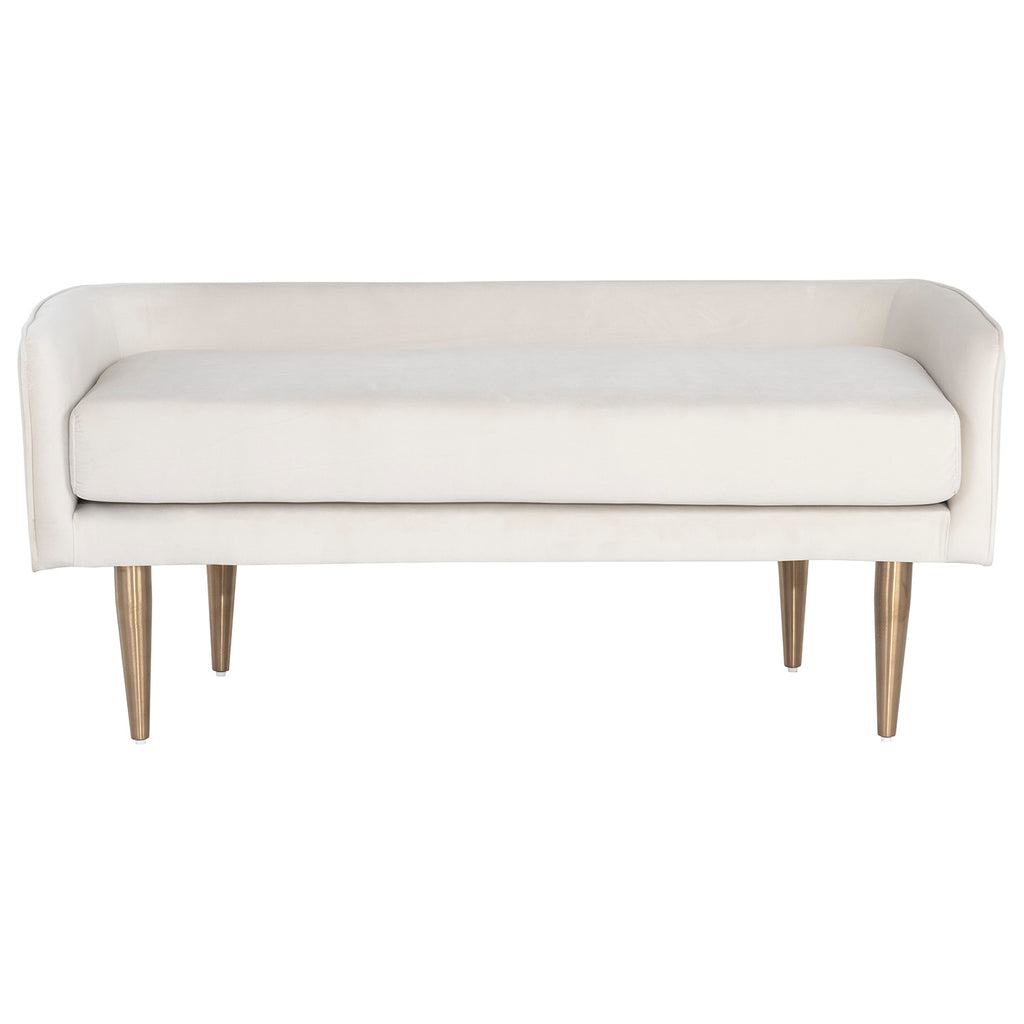 A delicately designed bench suitable for placement in a lobby or lounge, at the foot of a bed, or in an customized dressing room. Stocked in soft black, gray or cream sky fabric with brushed gold stainless steel legs.