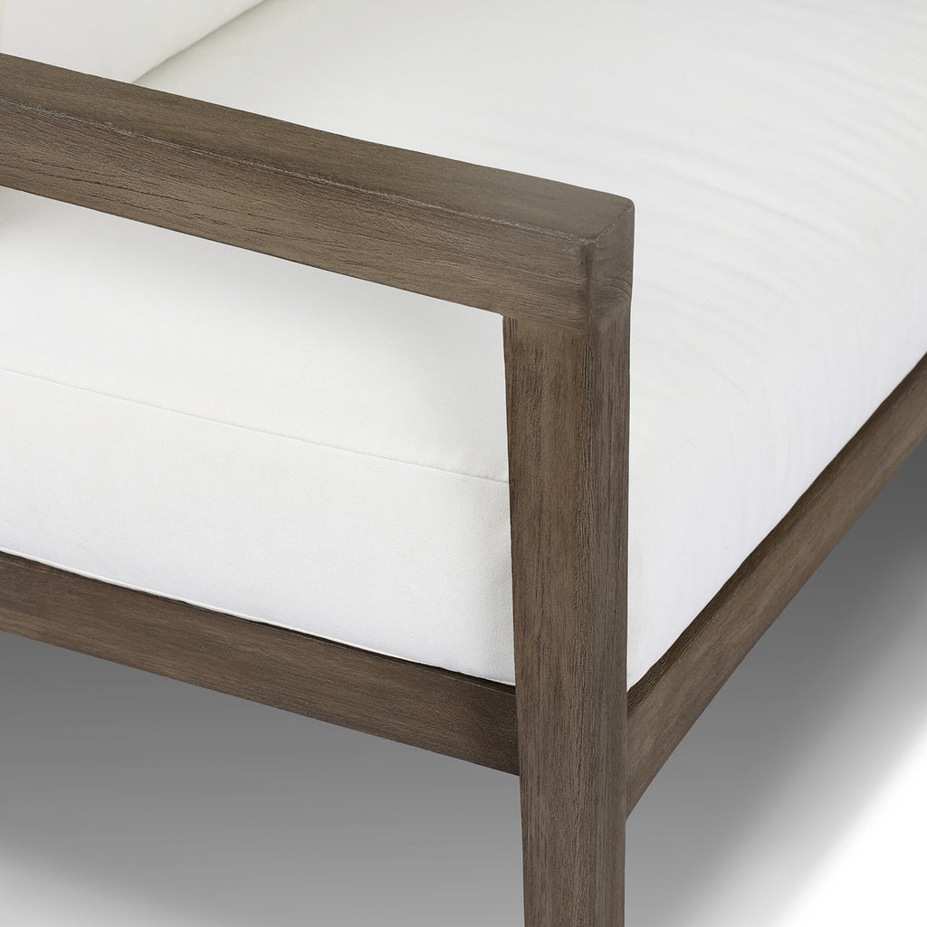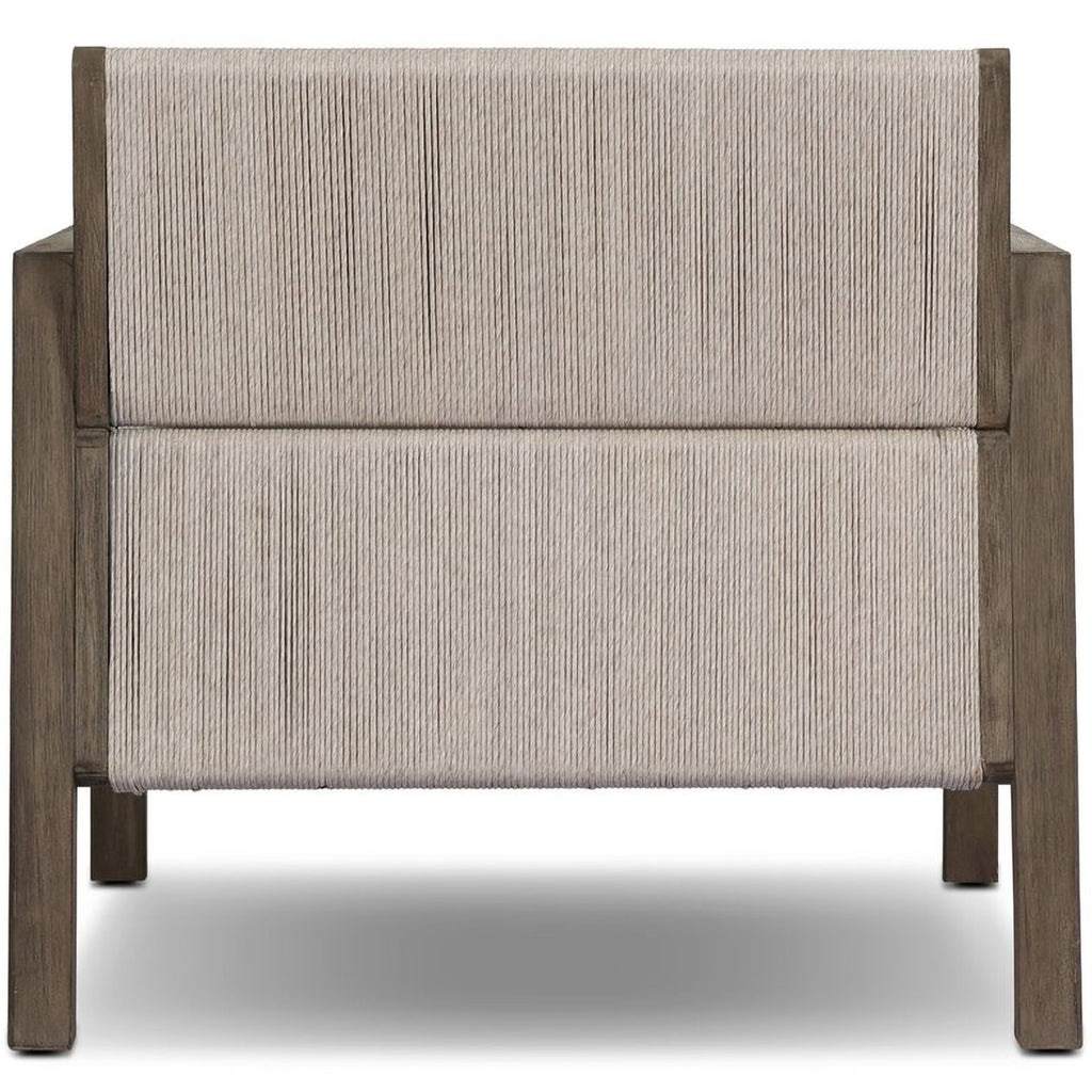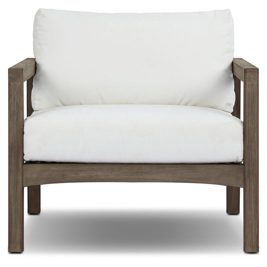 Sturdy Nordic shaping take on a lightness with a woven seat back. FSC-certified teak frames cream upholstery for a softened look on this outdoor chair. Cover or store indoors when not in use or during inclement weather.