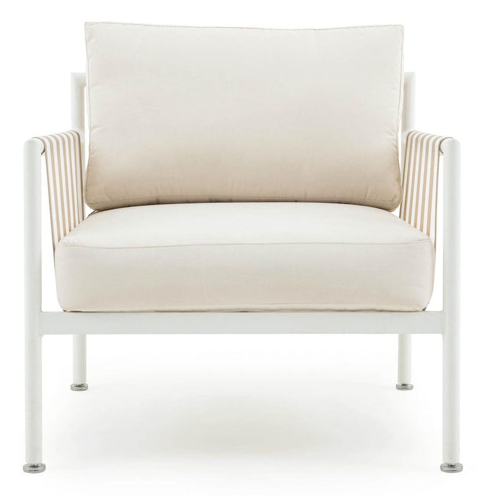 We're bringing the Riviera to you with the Dunes Cream Outdoor Collection, designed with an aluminum frame to prevent rust and ensure longevity, making it a durable addition to your backyard or patio. Crafted with outdoor-grade, UV-resistant polyester fabric and a powder-coated aluminum finish, this collection is built to withstand the elements while maintaining its chic appeal. The sectional features reversible cushions for easy stain management and high-density foam for indoor-level comfort, all while bringing the signature style of the French Riviera to your space with its stylish stripes. Plus, adjustable levelers offer the perfect solution for uneven outdoor surfaces, ensuring your sectional remains stable and wobble-free on any terrain.