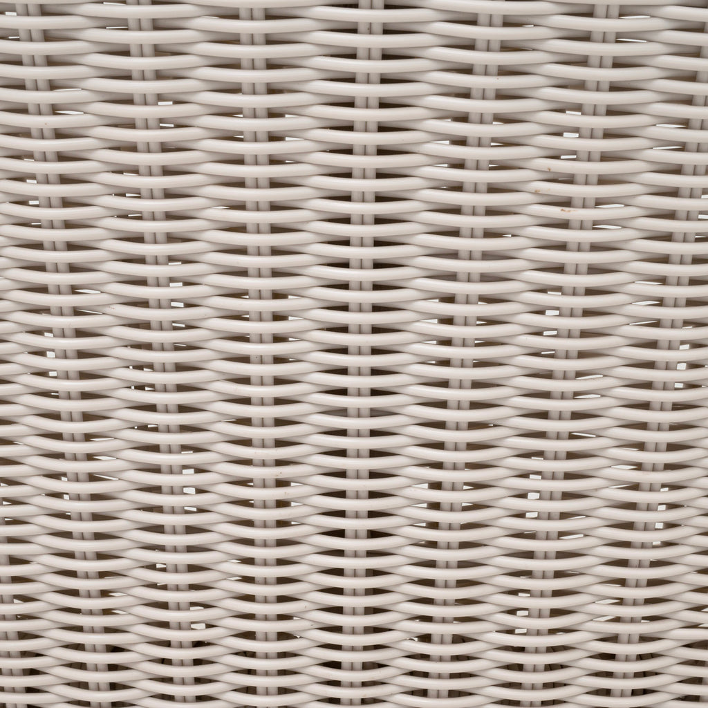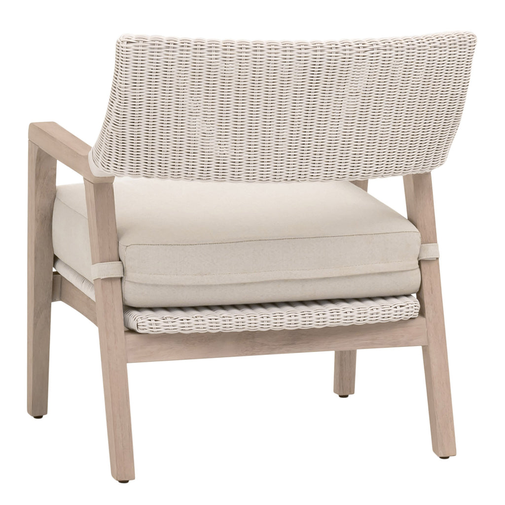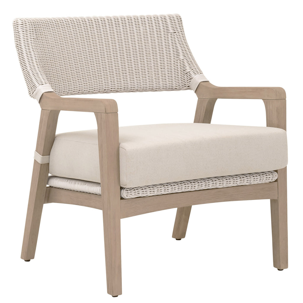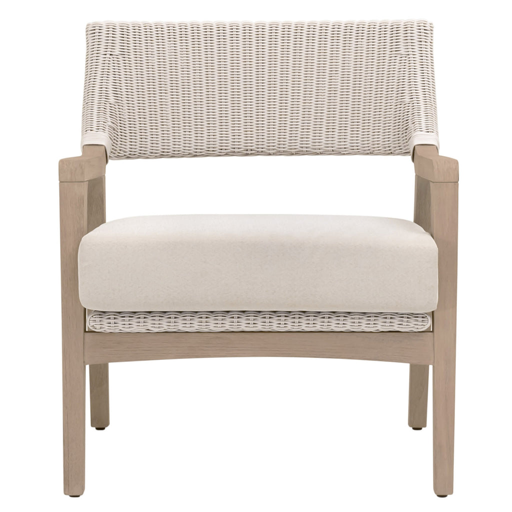 The Lucia Outdoor Club Chair by Essentials For Living perfectly blends coastal style with everyday functionality that is sure to enhance any outdoor living space. Its frame, constructed from solid teak wood, synthetic wicker, and aluminum, is suitable for outdoor spaces. The wicker is finished in pure white, and the teak has a washed ever finish that is resistant to change. These light hues will match with many patio and backyard settings. The woven design adds a distinctive visual texture, while the performance stone seat cushion, made from 100% Olefin fabric, assures high performance and durability. However, the chair and cushion should still be stored away in extreme conditions. The chair measures 28" wide, 27" deep, and 32.5" high, with a seat height of 19". The removable seat cushion with Velcro straps offers both convenience and adaptability, making this chair an excellent choice for those seeking a refined and functional outdoor seating solution.