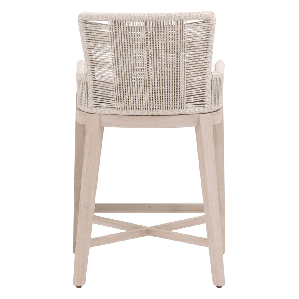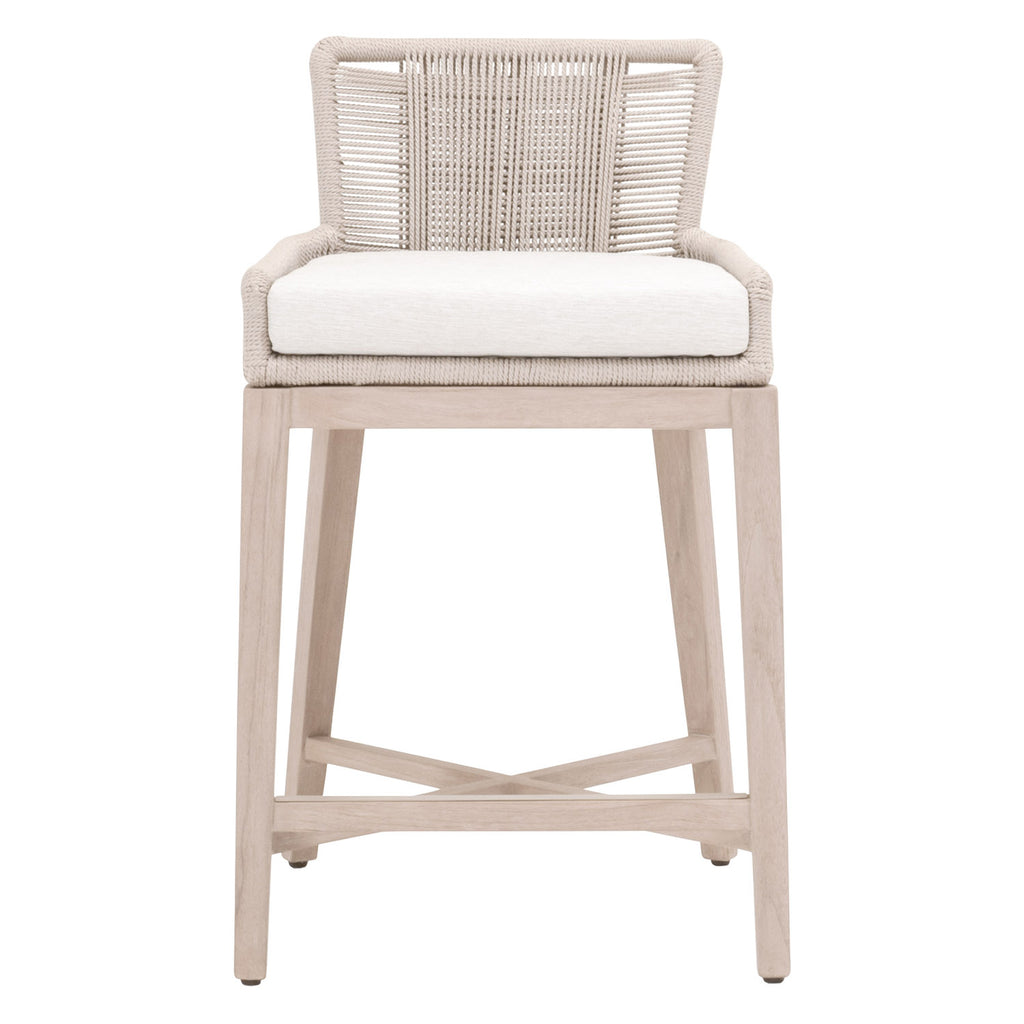 The fine details of the Overlay Outdoor Counter Stool by Essentials For Living make it an exquisite addition to any outdoor dining and bar space. With dimensions of 20.75in wide, 21in deep, and 35in high, and a comfortable 27in seat height, it is crafted with a solid teak base in a washed ever finish. The handwoven oyster twist polyolefin rope brings a distinctive texture and eye-catching weave design to the seat back. This is complemented by the removable performance seat cushion made of white speckle olefin fabric. The stool and cushion should be stored away in extreme conditions. Featuring a sturdy "X" stretcher base design with footrest, this stool provides stability and transitional style, making it an ideal choice for elevating outdoor dining and bar spaces with its refined and durable design.Woven Collection's Washed Ever Teak is a multi-step hand-applied finish. A wire brush is first used to distress the wood by hand before applying a polyurethane finish that is designed to resist naturally occurring wood finish changes from the outdoor elements. Due to the hand-applied nature of the finish, uneven application or uneven wire brushing is possible. Washed Ever Teak finish may fade and wear over time, and as the finish deteriorates, the natural teak underneath will become visible and gradually turn grey. The rate of this weathering will vary based on factors such as climate, exposure, and maintenance levels. To protect your furniture from the elements and minimize aging, we strongly recommend using outdoor covers.