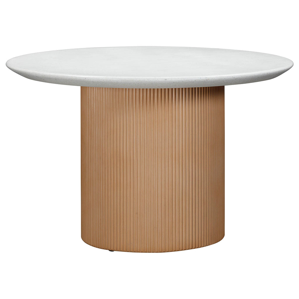 Transform your dining space with the Rose Faux Terrazzo and Terracotta Indoor/Outdoor Round Concrete Dining Table. Boasting a robust concrete base and adorned with beautiful modern terrazzo and terracotta finishes, this table seamlessly marries strength and style. Whether indoors or out, its simple silhouette and captivating neutral tones make it a perfect choice for worry-free dining, adding a trendy touch to any setting.