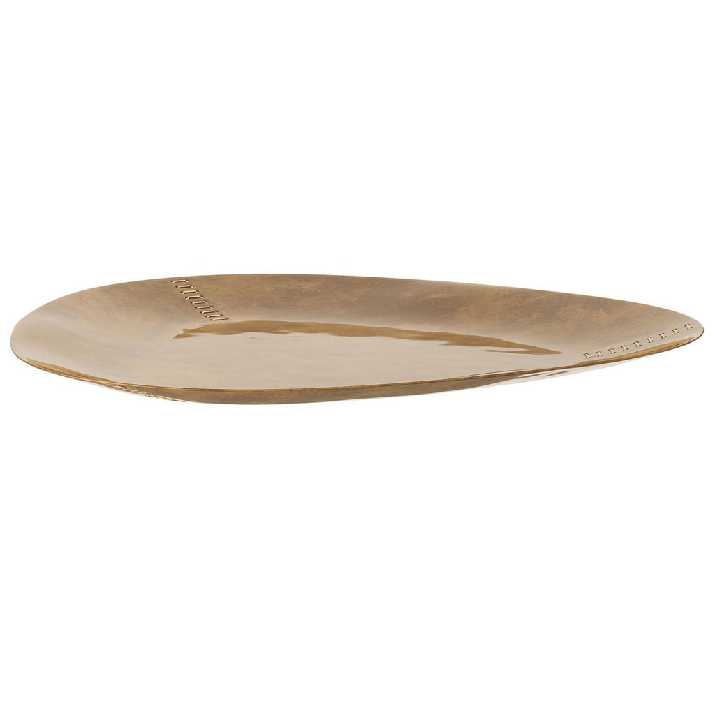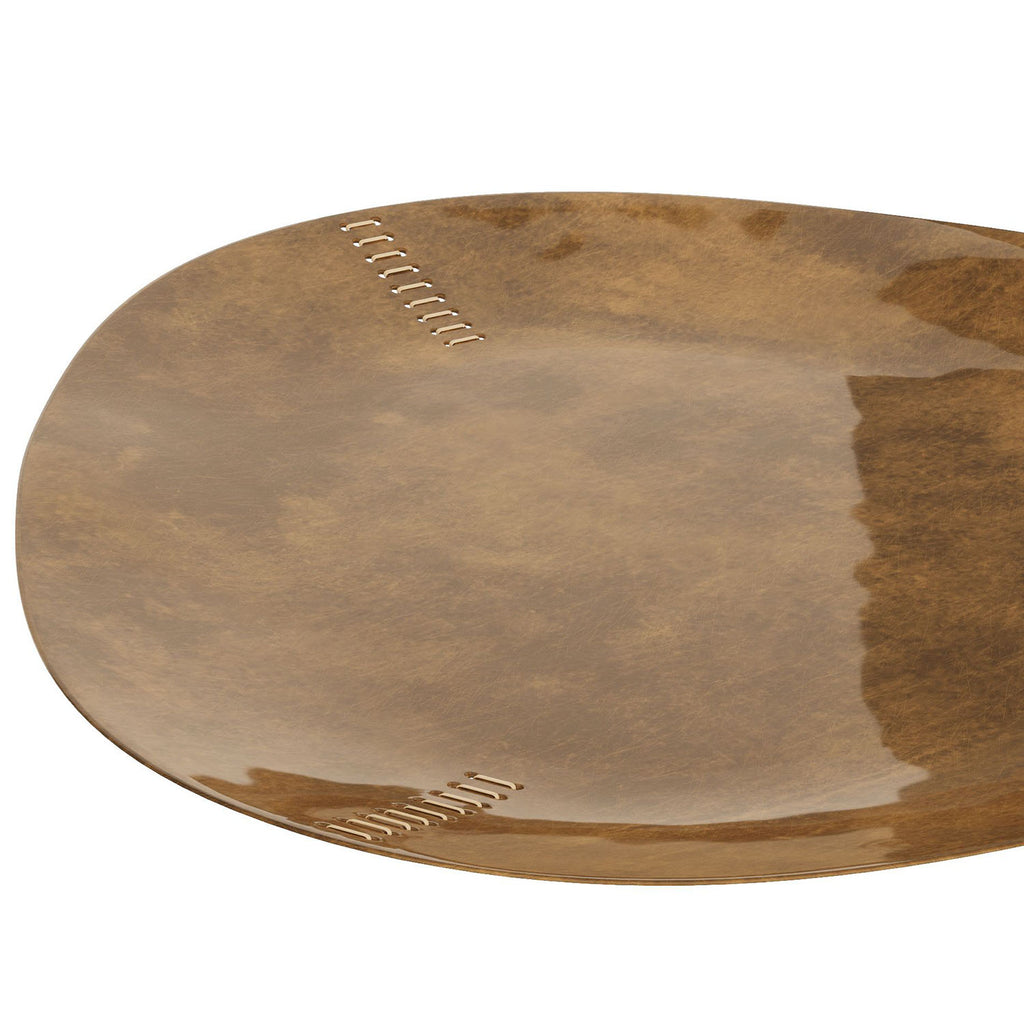 A freeform triangle tray finished in vintage brass is accented with natural rattan “stitching” at each corner for textural appeal. Inspired by leather valet trays, it makes a sophisticated receptable for every odd and end.