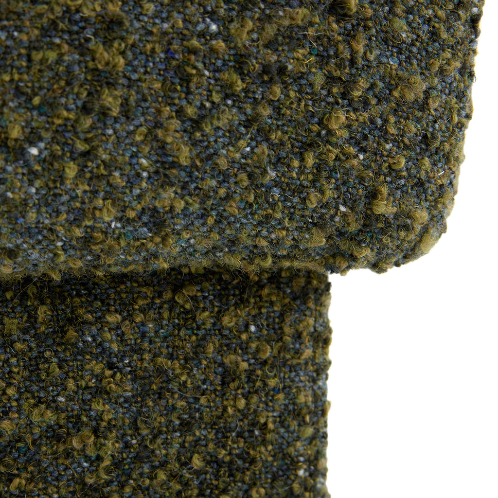 This mushroom-shaped stool is a delightful pop of color and texture. A well-padded seat of olive bouclé rests atop a matching base.