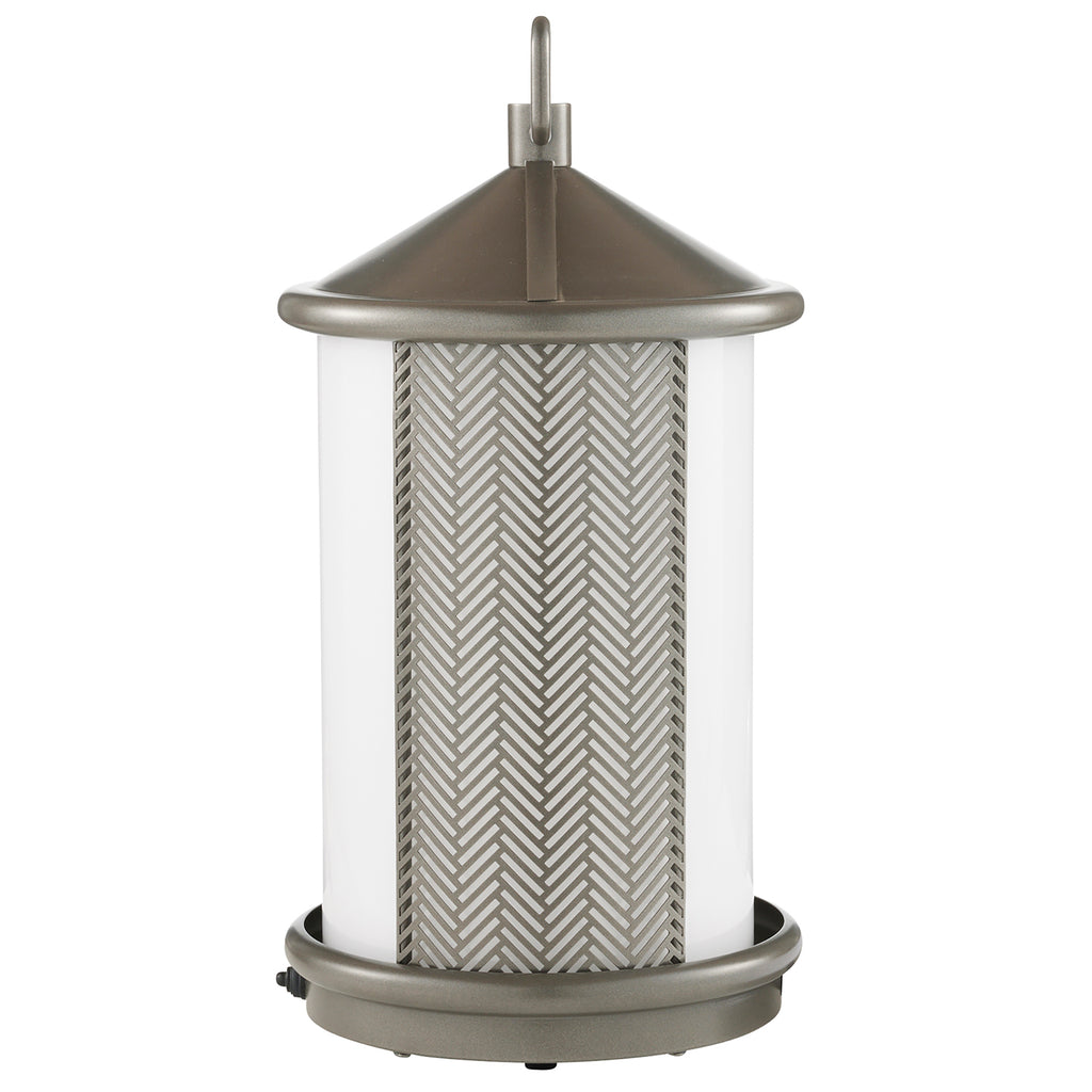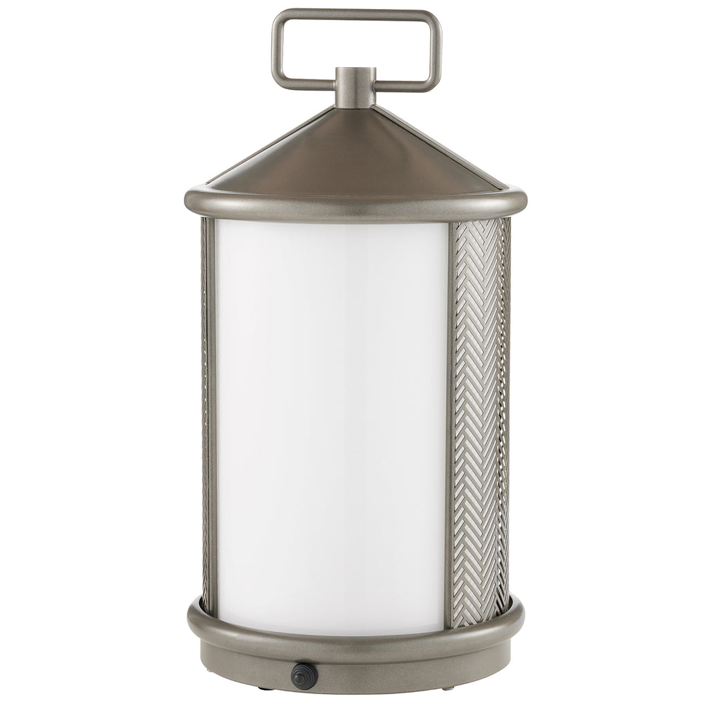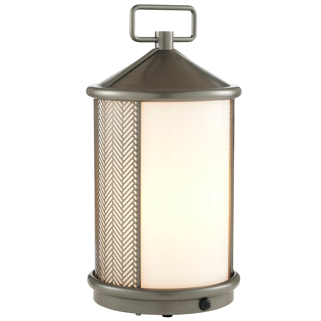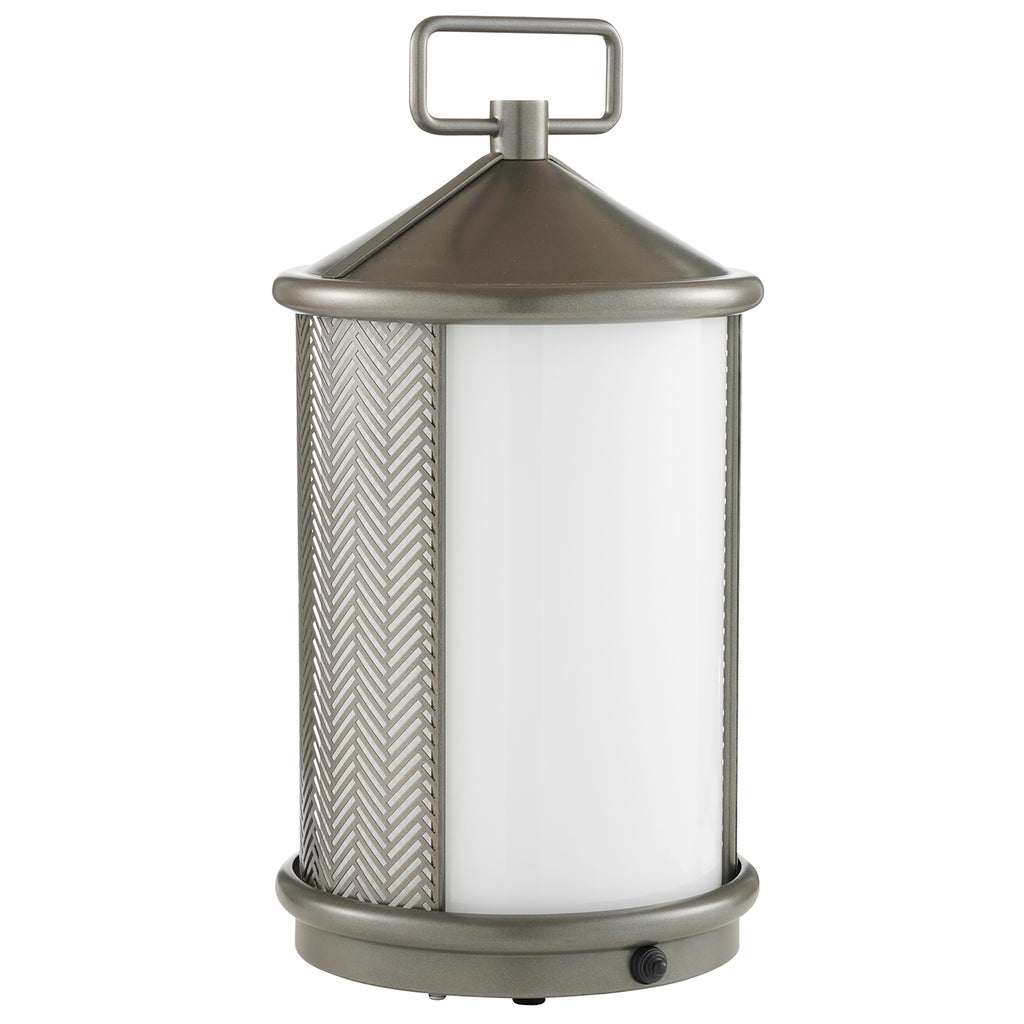 Our top-handled Arteriors Copeland was designed to illuminate any outdoor setting. Made of opal glass inset into a rounded frame of marine grade aged iron, this sleek lantern features herringbone panels embossed on either side. Protectively coated to withstand the elements with triple-coat, marine-grade enamel.
