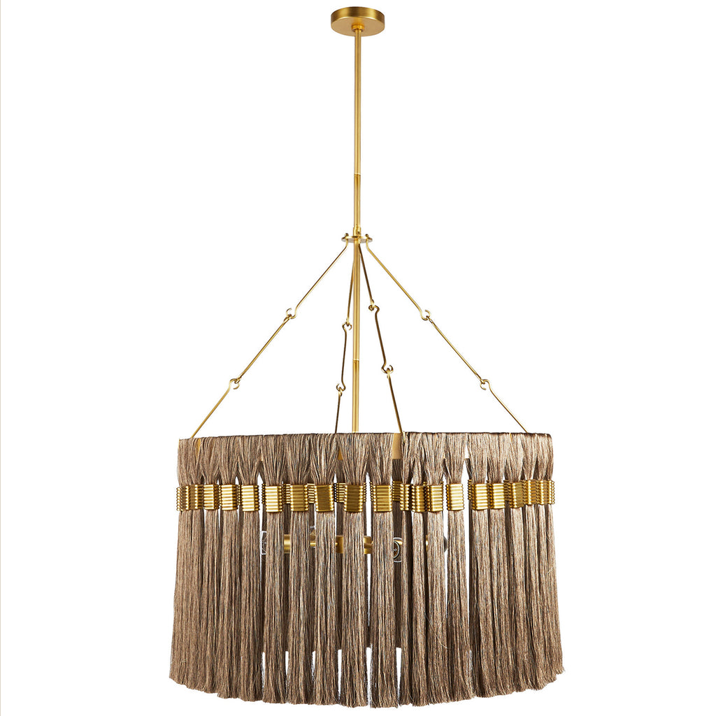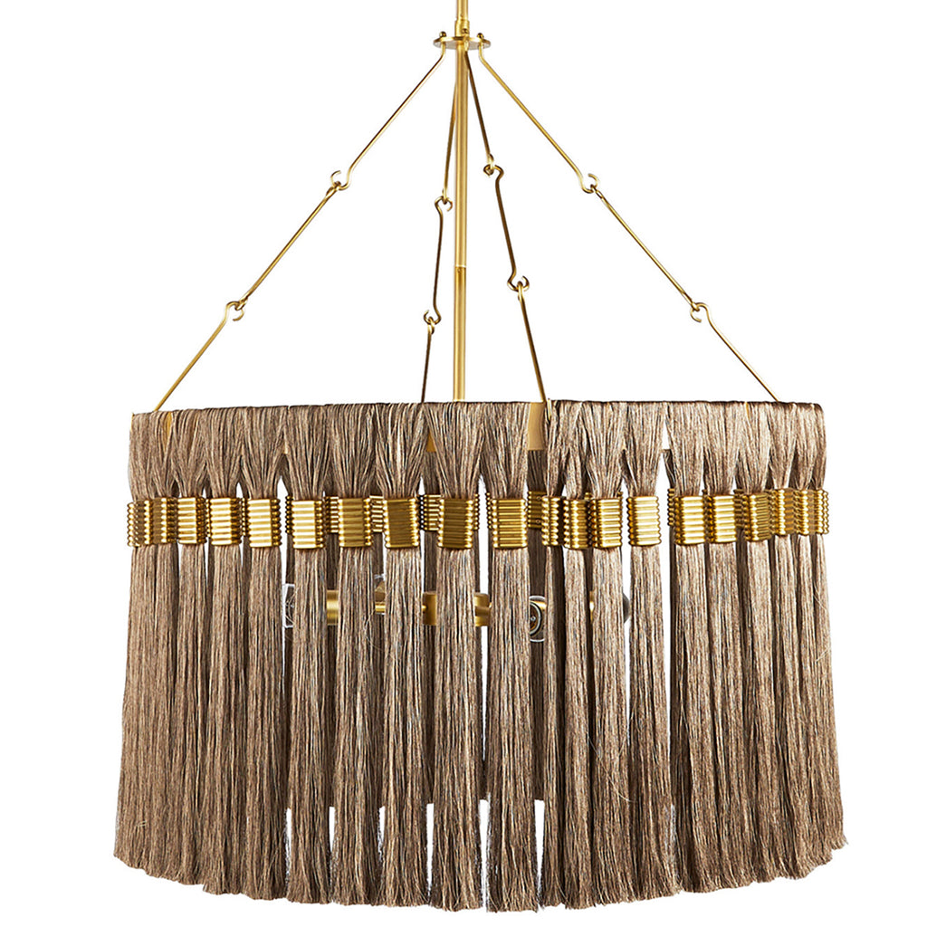 Anchored by matching hook and loop hardware, an elegant drum-shaped light draws its inspiration from the braids and tassels of ancient Greece. A flourish of silken gold and gray fringe is threaded, gathered and bound by shimmering antique brass hardware giving this impactful fixture a timeless appeal. Finish will vary.
