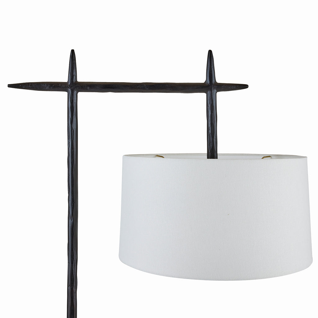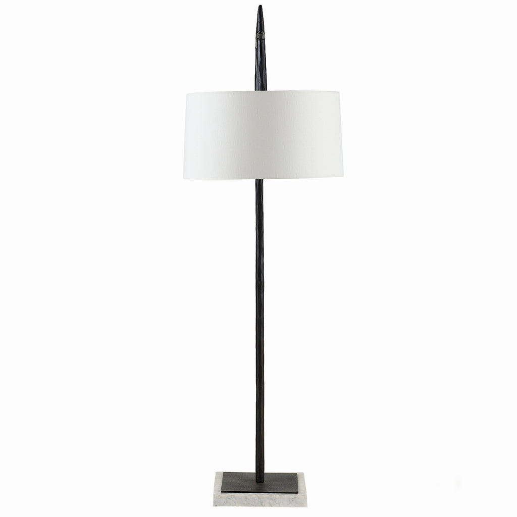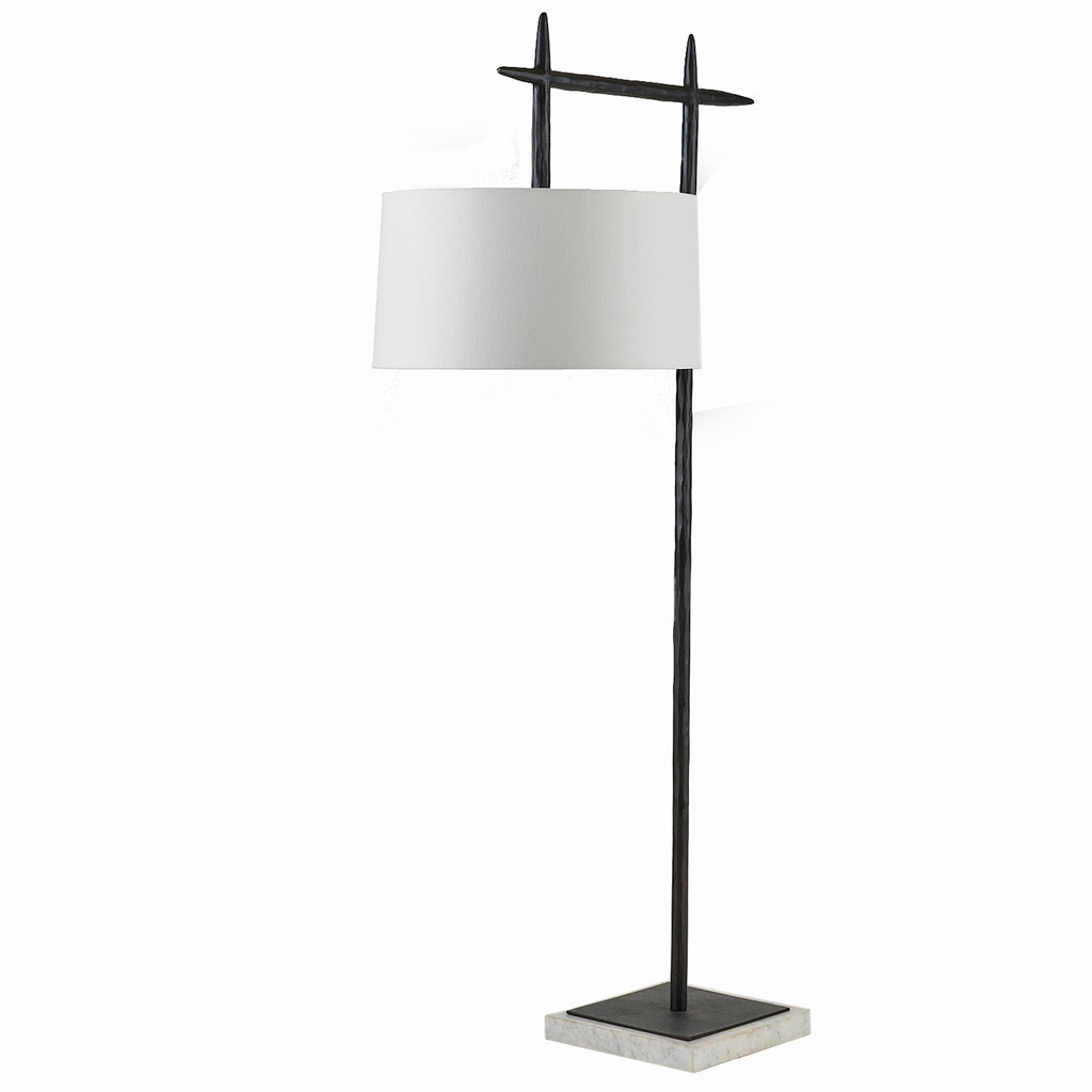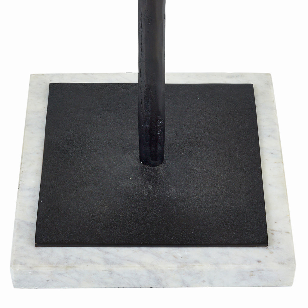 Intersecting spears of hammered blackened iron suspend an off-white linen drum shade with aplomb. Mounted on an elegant square base of white marble, this low-task lamp is ideal for illuminating a lounge area or dim corner with style. Clear silver cord.