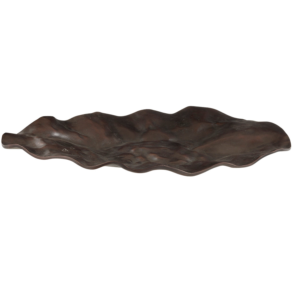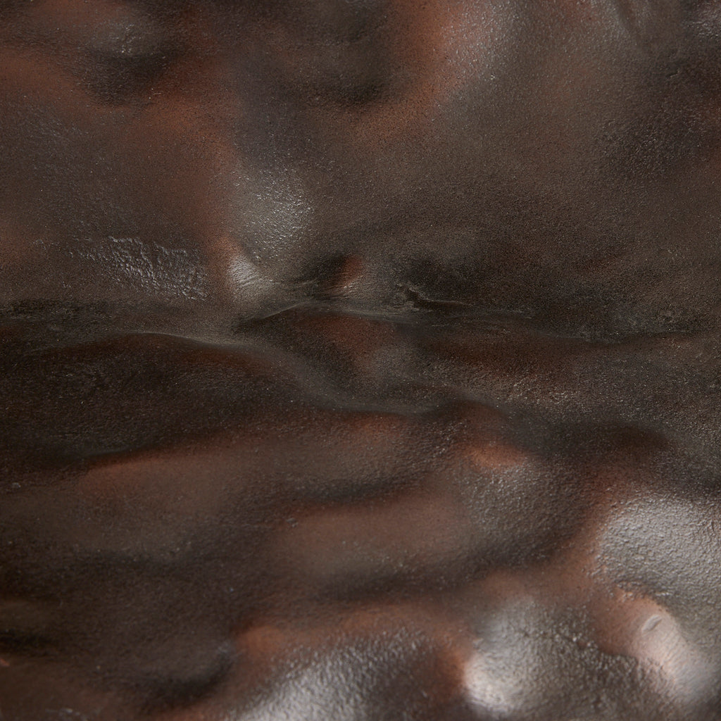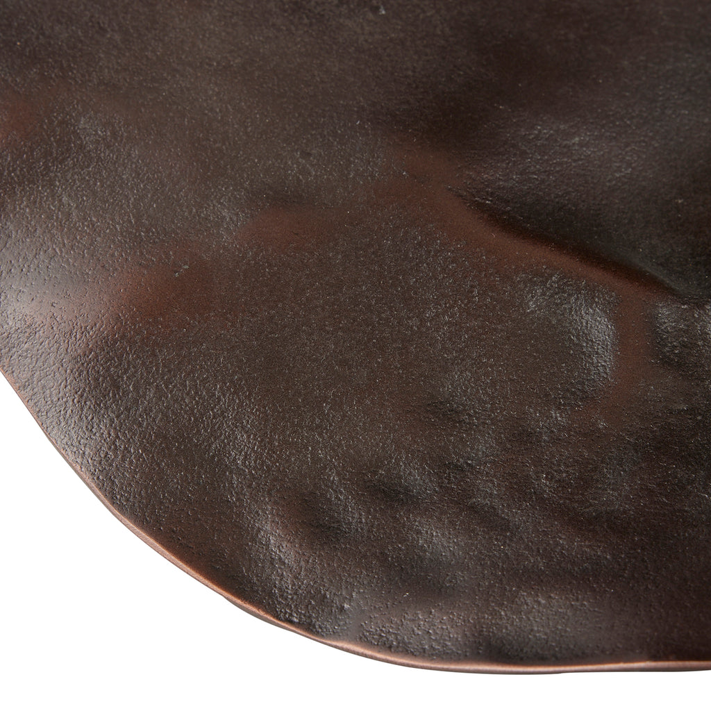 With a freeform hammered texture, this unique cast aluminum centerpiece resembles a crushed shield. Oversized to add drama, the antique copper surface delivers textural appeal. Finish will vary.
