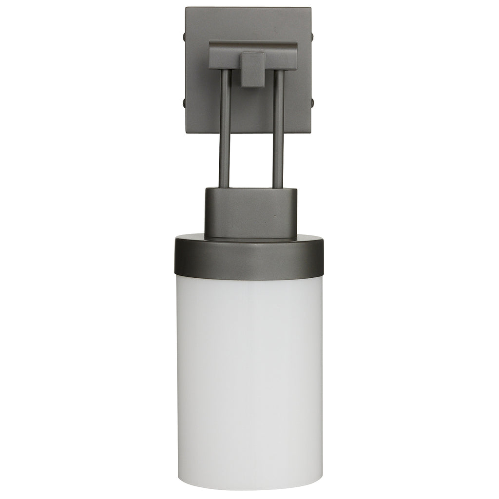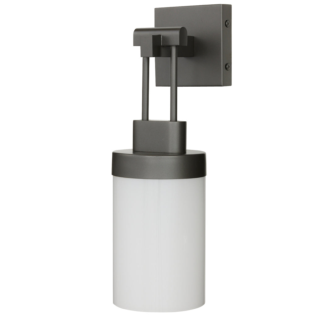 A hanging lantern of opal glass and aged iron-powerdercoated aluminum possesses an eastern allure. Inspired by Japanese wood joinery, this minimalist style is finished with a protective coating to withstand the elements. Finish will vary.