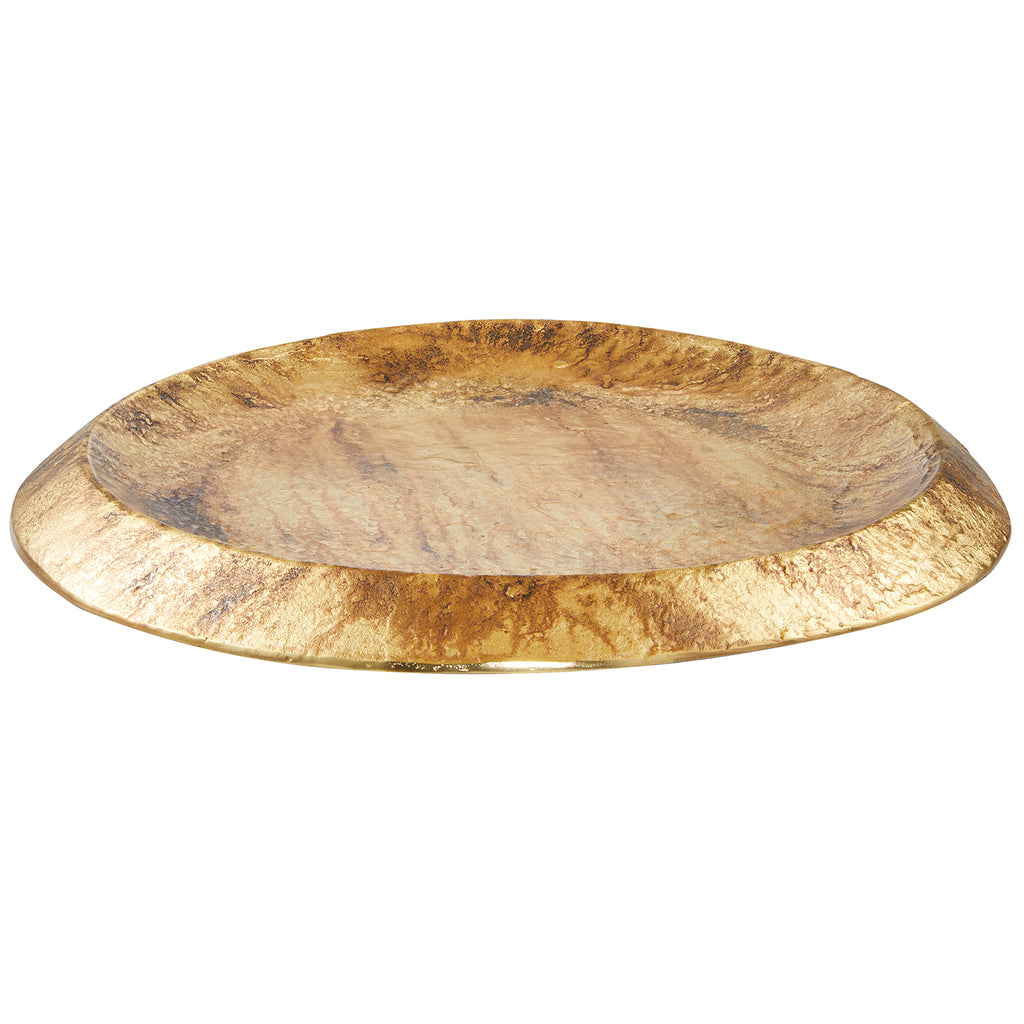 Simplistic in form, a shield of distressed antique brass is carefully aged to appear effortlessly burnished. We designed this cast aluminum centerpiece with a shallow dip and floating edges to make an over scaled home for your treasures. Finish will vary.
