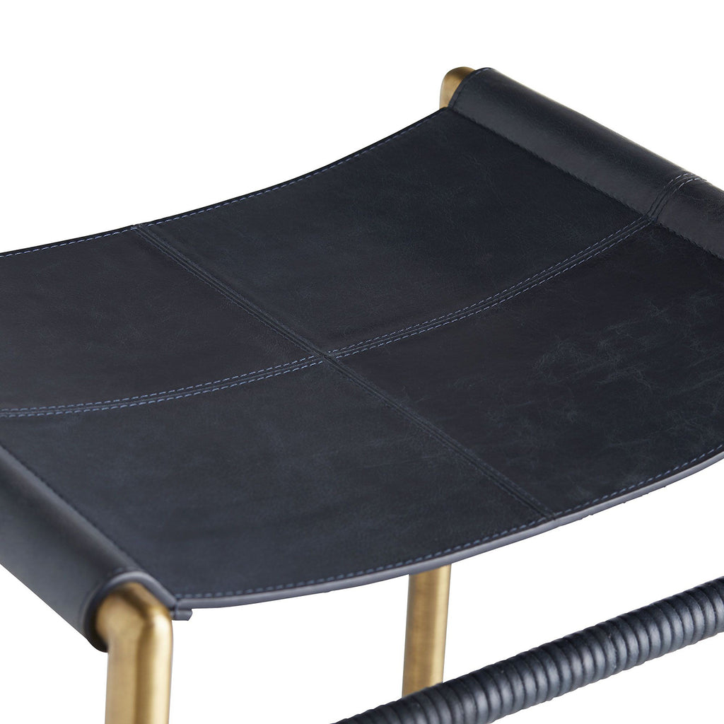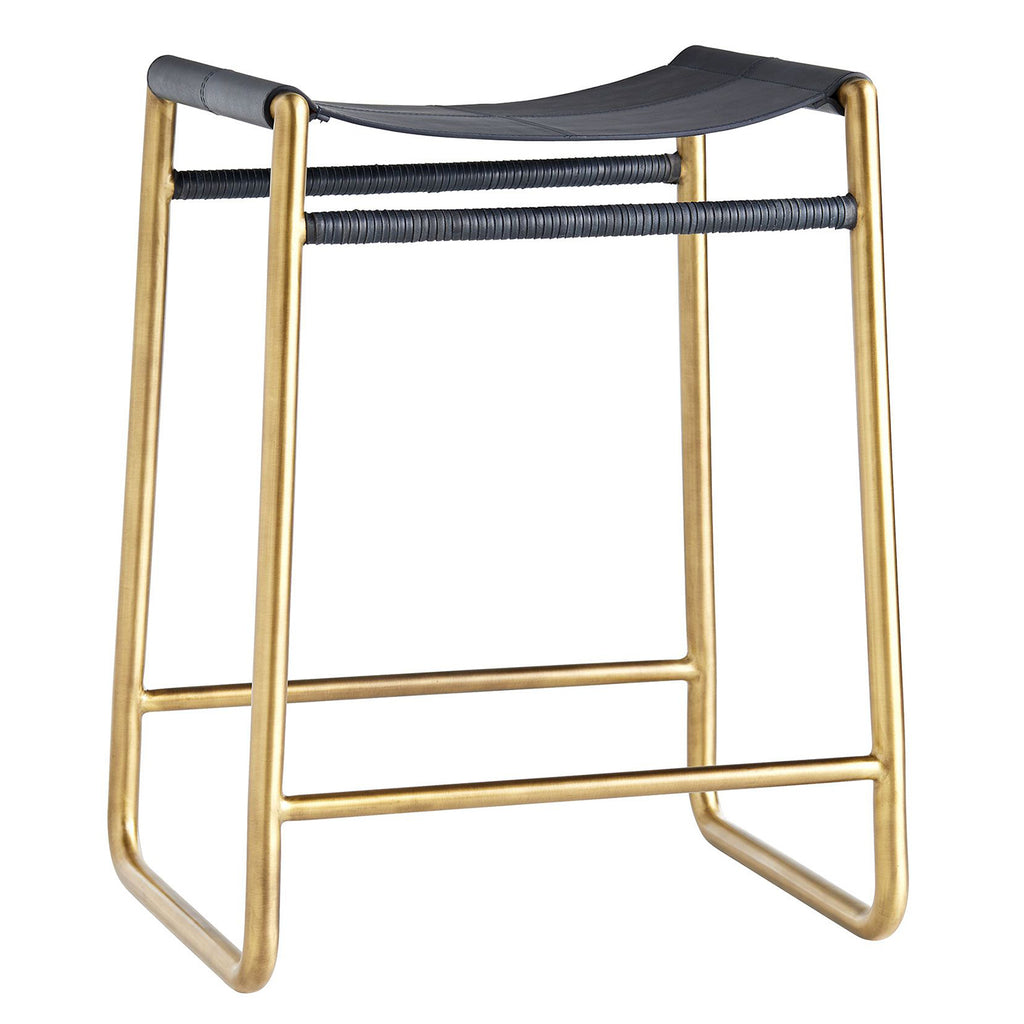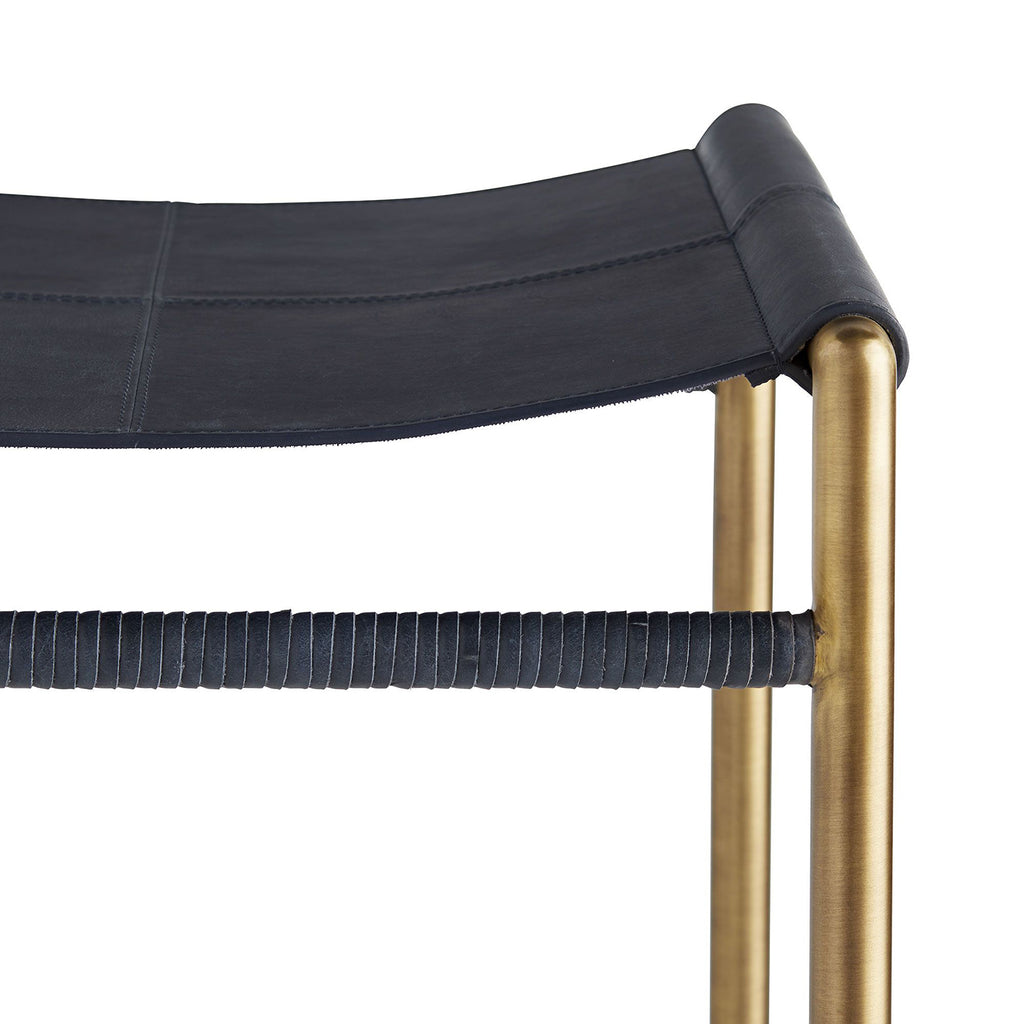 A marriage of form and function, this counter stool has a refined meets rustic vibe. An indigo leather seat lends an organic touch to the modern style of its antique brass frame. The top stretchers on either side have been wrapped with matching leather to create cohesiveness. The unrestricting design of no back or arms creates a minimalist profile, which makes this ideal to tuck under a counter. Finish and leather may vary.