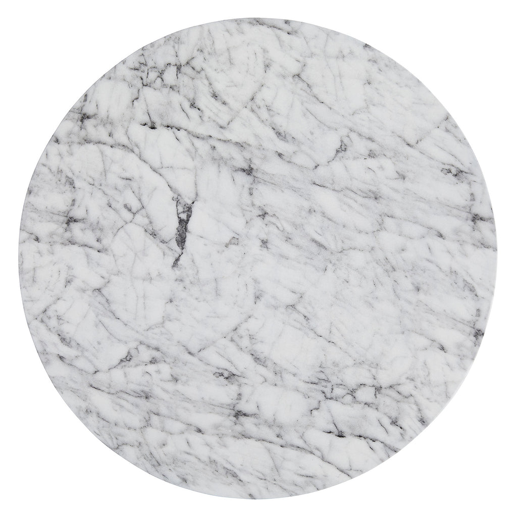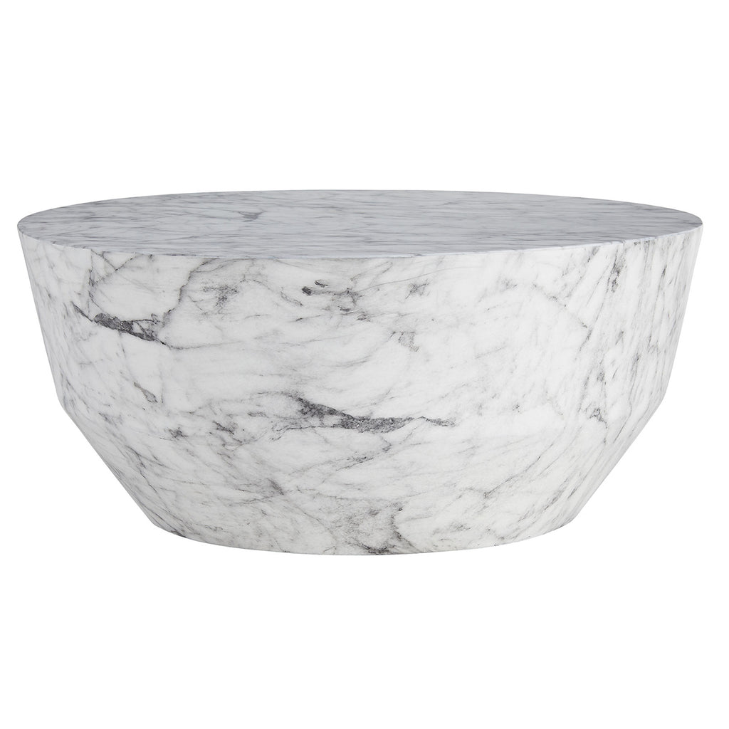Made of lightweight concrete, a white faux-marble finish transforms this Arteriors drum cocktail table into a functional work of art. This now polished piece presents a versatile aesthetic that blends with contemporary and classic décor. Its sturdy foundation makes this a great piece to park drinks or hors d'oeuvres when entertaining. Natural stone may have a softer subtle grey veining to bold and dramatic with thick dark veining. No two will look alike.