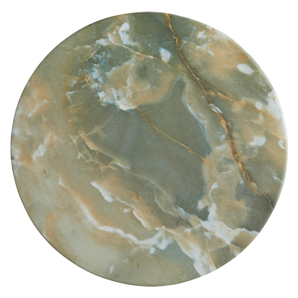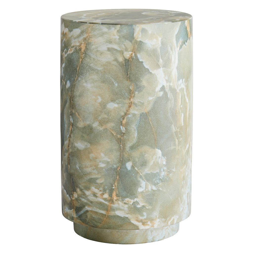 A jade faux-marble finish instantly transforms the lightweight concrete construction of this Arteriors accent table into a functional work of art. Light to green hues span the surface, gathering and dispersing alongside the simulated veining to create a look that will leave you transfixed. Its structural foundation anchors a room and provides the perfect platform for a tray of savories. Natural stone may have a softer subtle grey veining to bold and dramatic with thick dark veining. No two will look alike.