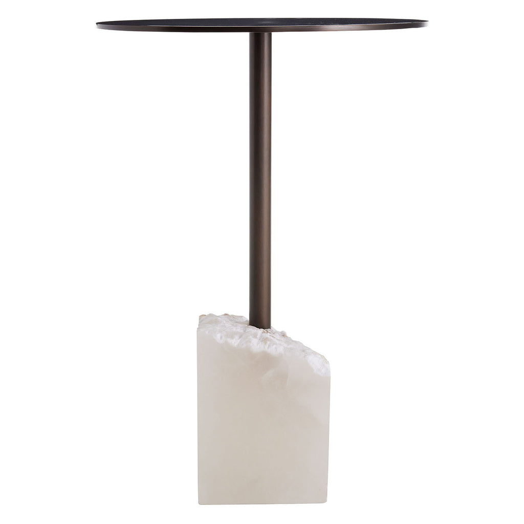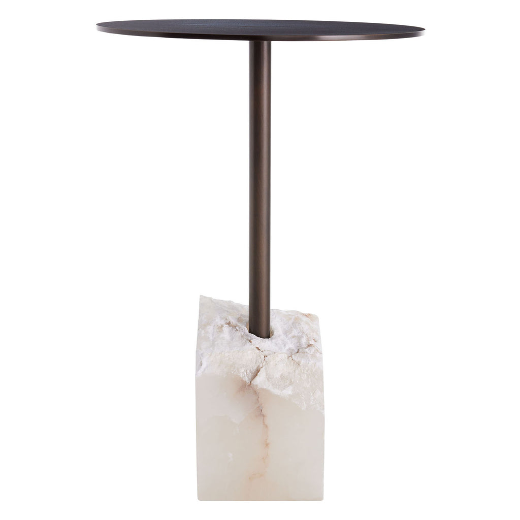 Arteriors Home lighting embodies the perfect balance of form and function, creating an ambiance that is both captivating and inviting. A sleek combination of rich materials gives tons of character to the Arteriors Jane Accent Table. A round bronze steel top and matching post are embedded into a rough hewn white alabaster base. Truly rugged and refined, this petite table balances a cocktail just within reach.