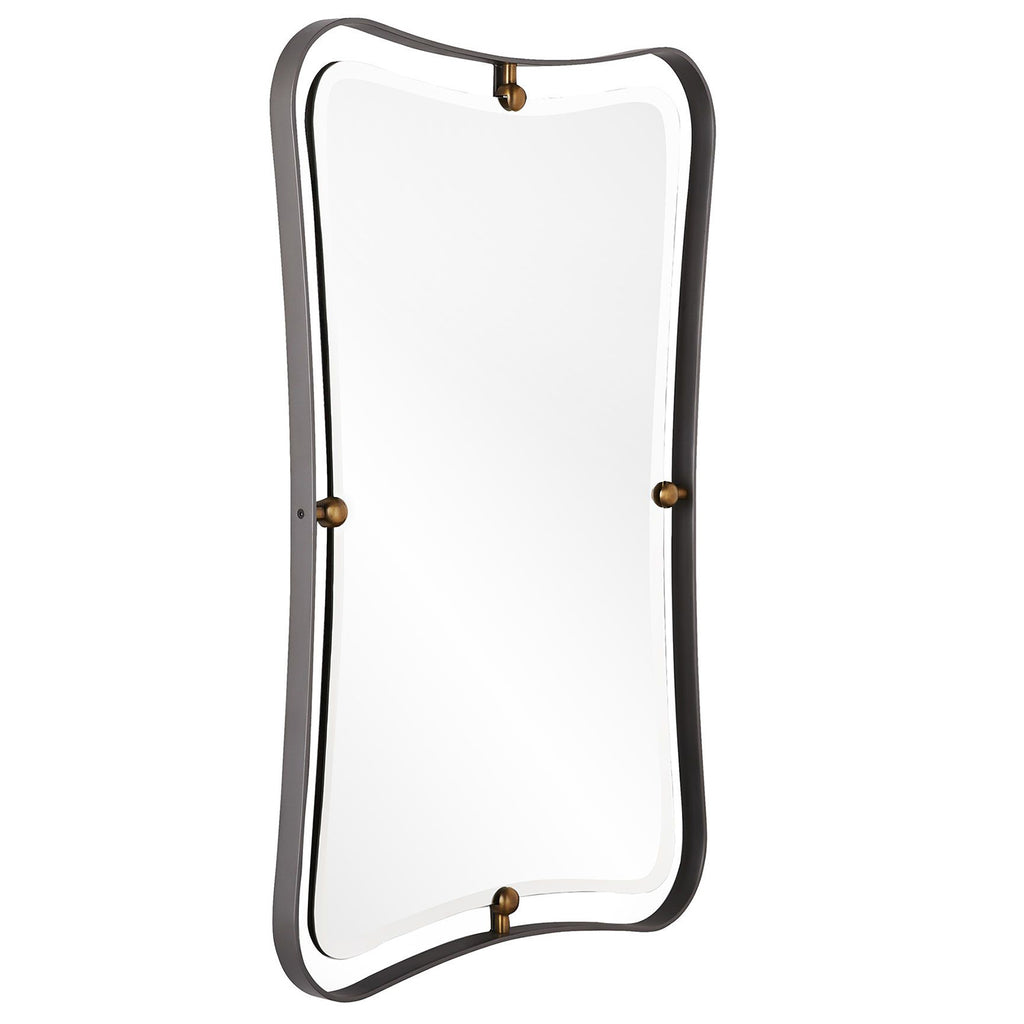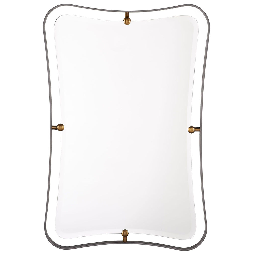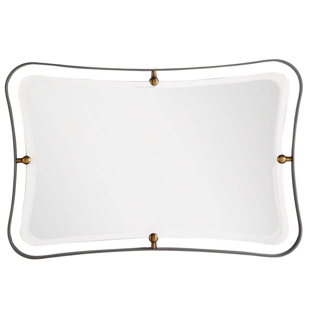 Arteriors Home embodies the perfect balance of form and function, creating an ambiance that is both captivating and inviting. Whether you desire a statement piece for your entryway, an artfully distressed mirror for your living room, or a sleek and minimalist design for your bathroom, Arteriors Home has the perfect mirror to elevate your space to new heights. Featuring a natural iron frame, polished brass accents and a plain mirror, the Arteriors Janey is a contemporary lesson in mixed materials. The open frame design gives this mirror dimension and depth, while the dual finishes make its simple form outstanding. A unique hourglass shape gives it a daring dynamic that will make a statement in any space. Security cleat hanging hardware allows for vertical or horizontal display.