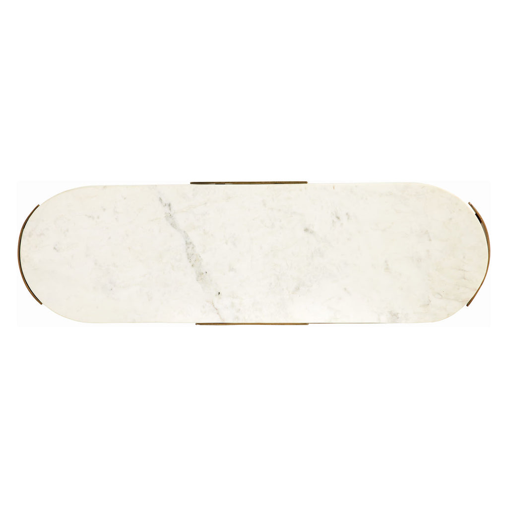 Refined elegance is exhibited in the subtle design details of this minimalist console. Drawing inspiration from the Art Deco period, a slender antique brass iron frame gradually flares upward, showcasing a white marble top that appears to float within the frame. Natural stone requires periodic sealing.