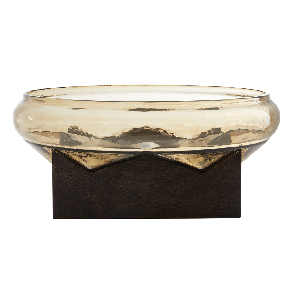 Arteriors Home brings sophistication and style to any interior design project with their collection of decor and tabletop pieces. This beautiful Arteriors Jarvie amber glass centerpiece rests on an umber stained wooden base molded to the shape of the glass. The juxtaposition of materials creates interest for this centerpiece on your table. Finish may vary.