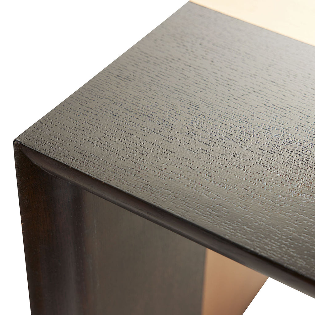The Arteriors Kiersten takes color-blocking to the next level with a unique blend of mixed materials. Each two-tone table features a balance of hand-applied sable and antique brass finishes on oak veneer. This set of nesting tables easily refresh a space by alternating which color is front-facing.