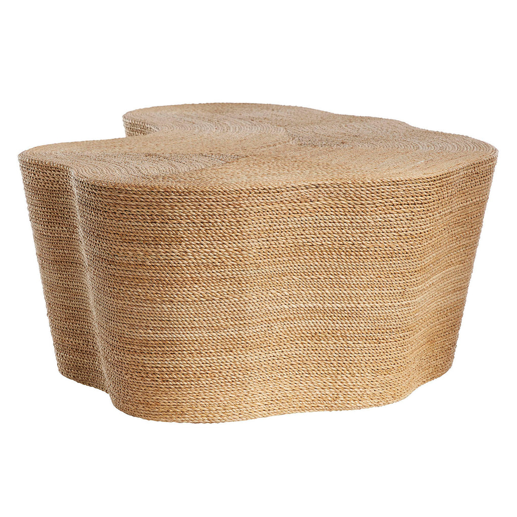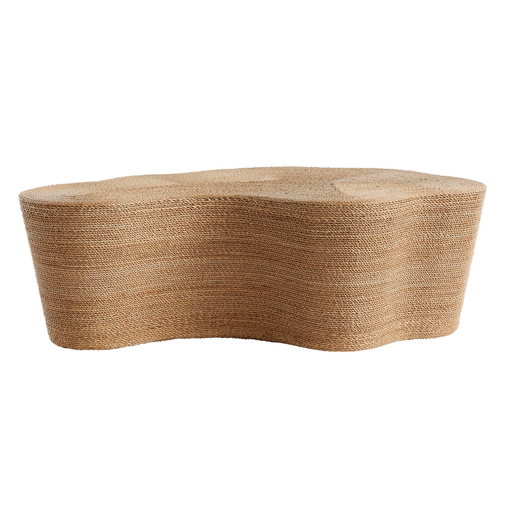 A series of winding curves define the organic shape of this Arteriors cocktail table, all wrapped in natural abaca. A pattern of concentric lines flow over the entire surface, showing off the varied tones of the material.