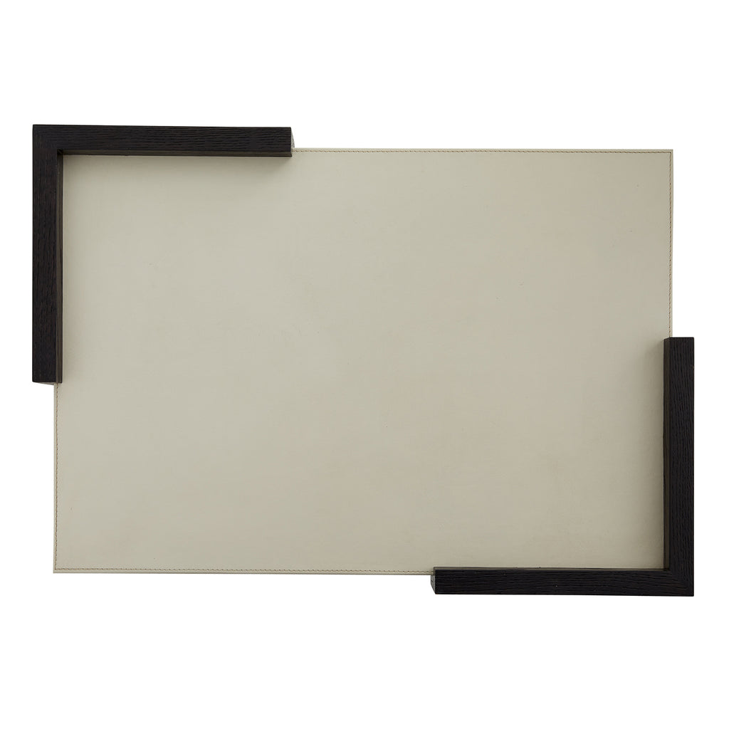 Arteriors Home brings sophistication and style to any interior design project with their collection of decor and tabletop pieces. The Arteriors Odin tray, made from a pairing of oak and leather, is an eye catching piece on its own. The unique, modern design recalls the Bauhaus movement, with dramatic angles and bold presence. The plank is wrapped in rich, ivory leather for a sophisticated touch, anchored on adjacent corners in ebony-finished oak. Finish may vary.