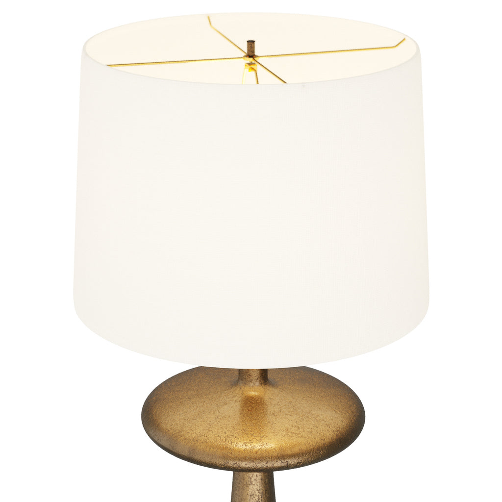 Inspired by the Arteriors Putney lamp, we created a large-scale version. From each direction, its silhouette reveals three stacked rounded forms—a cylinder, a disc, and an elongated tapered coin base. Showcasing angular composition and balance, it has a mid-century feel with an updated take on the style via its cast aluminum in an antique brass finish. Topped with an off-white linen shade with off-white cotton lining. Clear silver cord and three-way rotary switch. Finish will vary.