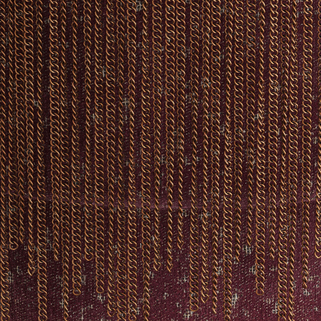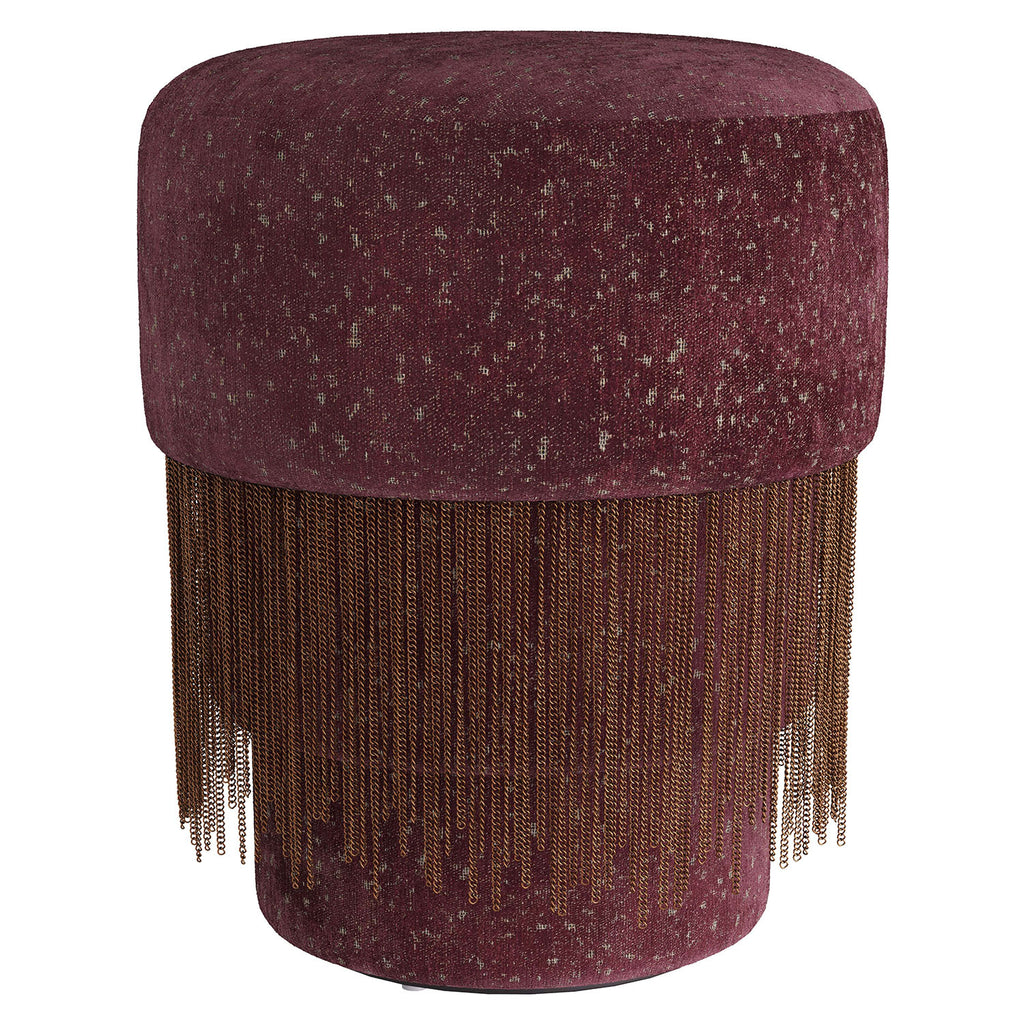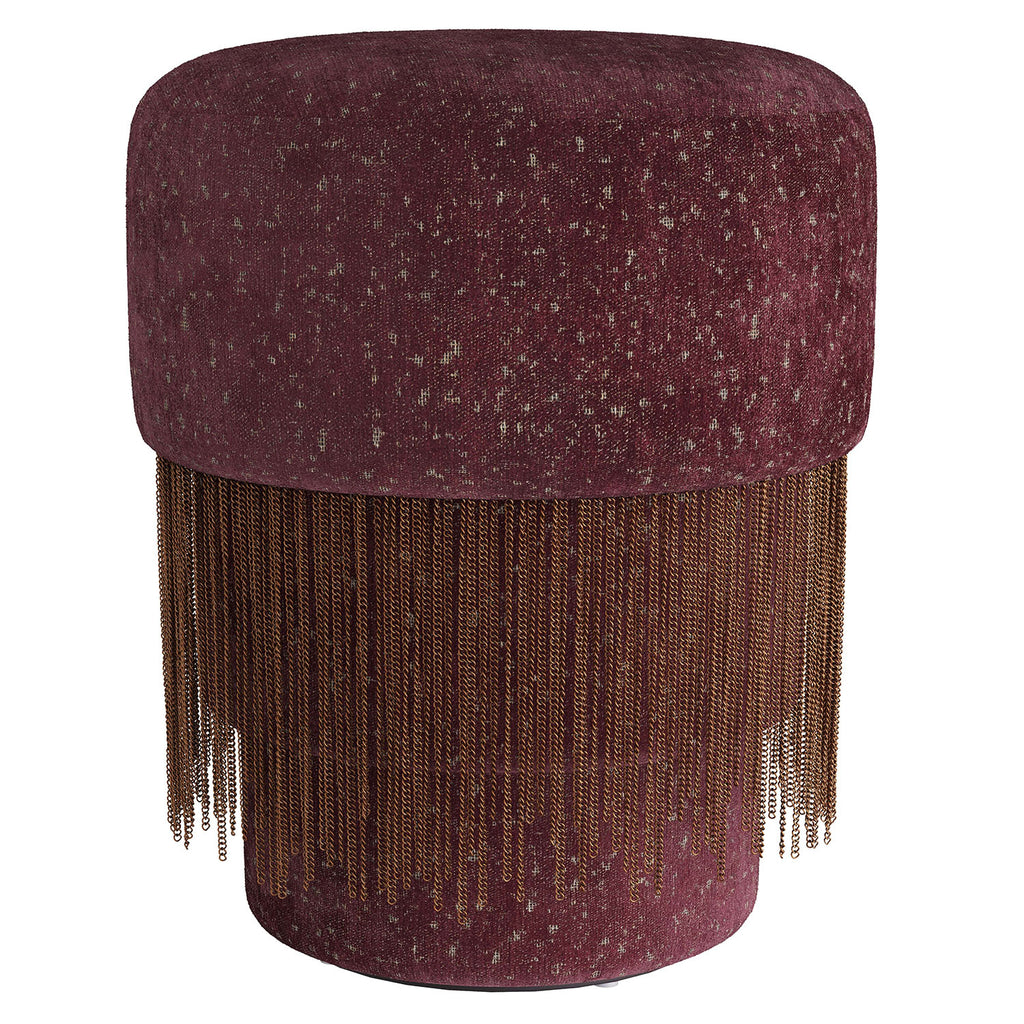 Our Arteriors Twyla ottoman adds a playful touch of nostalgia with this unique combination of color and materials. The expressive stool is fully upholstered in heathered bordeaux chenille, with a fuller tuffet resting upon a slimmer column plinth. Fine, antique brass chain, in varying lengths, forms a flapper-style fringe skirt. Finish will vary.