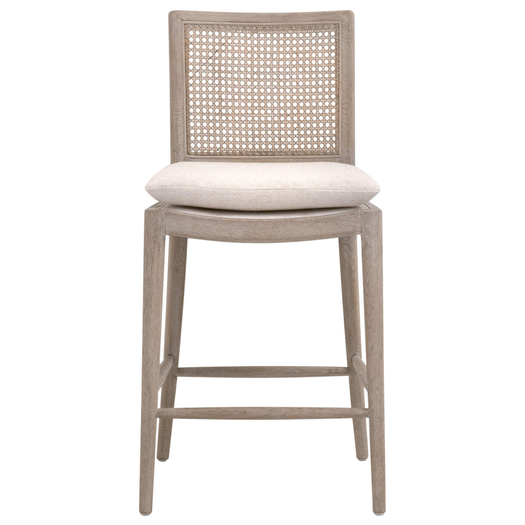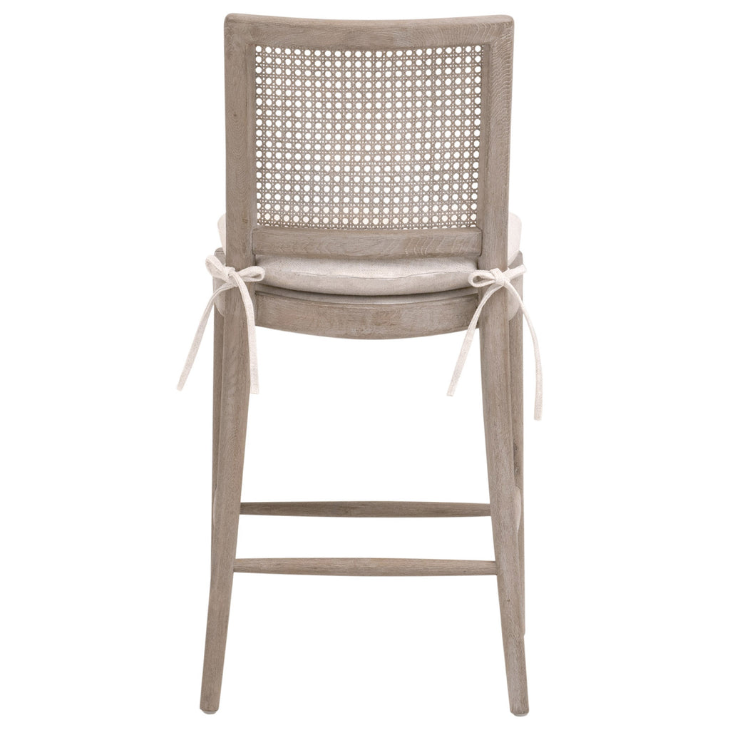 The Blume Counter Stool by Essentials For Living seamlessly combines traditional design with contemporary elements, making it an ideal piece for a transitional space. It measures 18.75" wide, 21.75" deep, and 39.25" high, with a seat height of 26in. Crafted with a natural gray solid oak wood frame and cane back, it provides an airy, stylish aesthetic. The seat cushion is removable with ties and upholstered in a performance textured cream linen. This material is made from a durable polyester-linen blend that is stain-resistant and designed to withstand everyday use. With a contoured seat and leg stretchers for added support, this transitional stool delivers both comfort and durability, making it a refined addition to any bar or dining space.