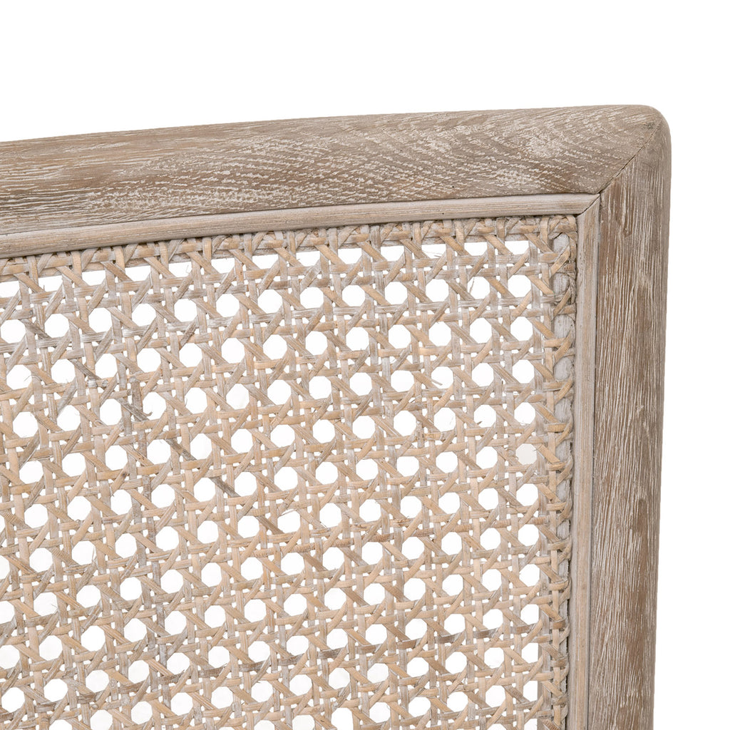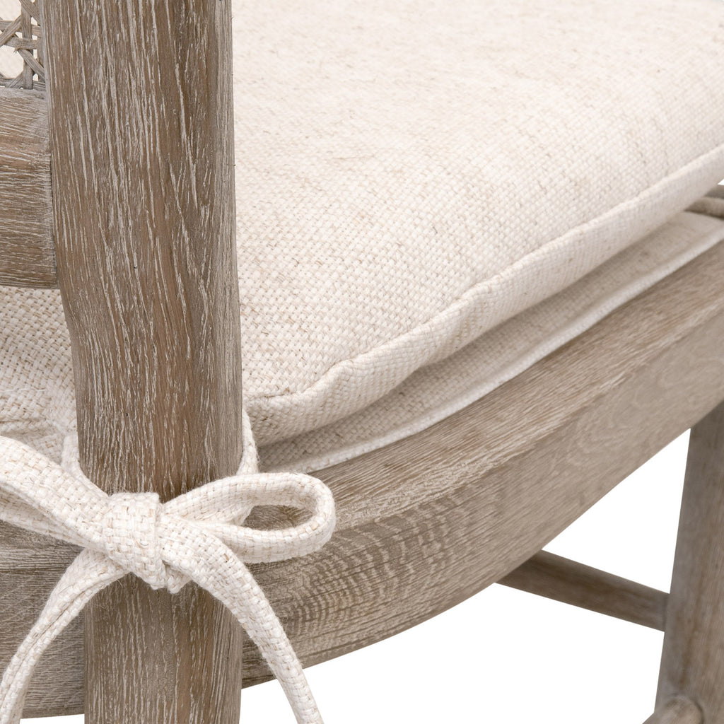 The Blume Dining Chair by Essentials For Living seamlessly combines traditional design with contemporary elements, making it an ideal piece for a transitional space. It measures 19.5" wide, 23" deep, and 35" high, with a seat height of 18.5in. Crafted with a natural gray solid oak wood frame and cane back, it provides an airy, stylish aesthetic. The seat cushion is removable with ties and upholstered in a performance textured cream linen. This material is made from a durable polyester-linen blend that is stain-resistant and designed to withstand everyday use. With a contoured seat and leg stretchers for added support, this transitional chair delivers both comfort and durability, making it a refined addition to any dining space.