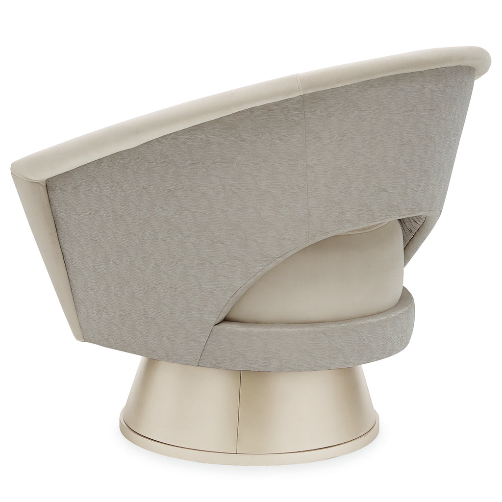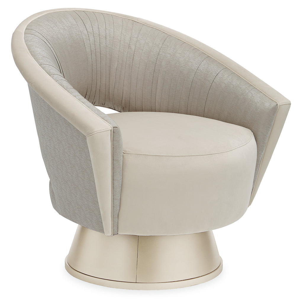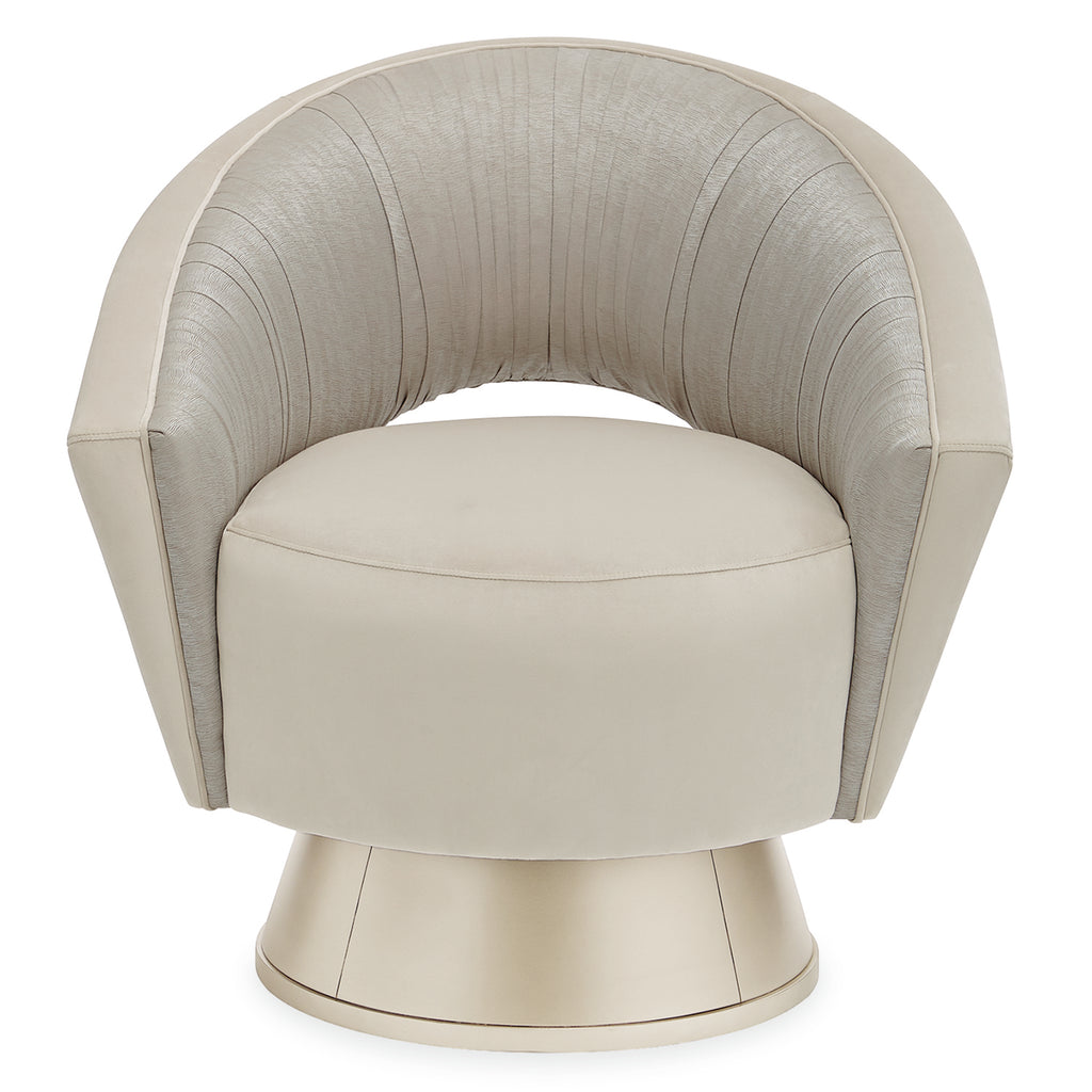Don't be surprised when this chair turns out to be everyone's favorite. Its stunning contemporary design is matched with a fun and functional swivel base wearing a Soft Silver Paint finish. Ultimately neutral, its seat and top rail are covered in a soft buff velvet, while its inside arm and inside back are highlighted by a distinctive tight pleating effect in an elegant satin fabric with subtle touches of Robin's egg blue that adds even more glamour.