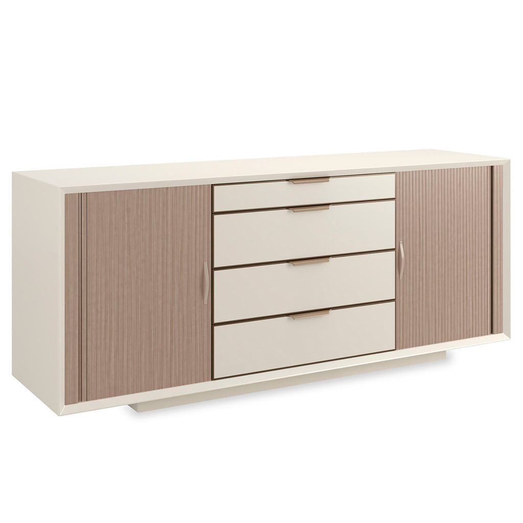 A masterful mix of form and function, this mid-century-inspired console stirs interest with its linear design and host of storage options. Sliding tambour doors in Moonstone add texture and contrast to an Almond Milk finish. Framed in Almond Milk, four center drawers feature vinyl fronts, embossed with a pattern reminiscent of rain trickling down a windowpane. Expansive storage offers two fixed shelves on the left, offset by five soft close drawers on the right. Modern and multifunctional, its clean-lined design is well-suited for living, dining, and bedroom interiors.