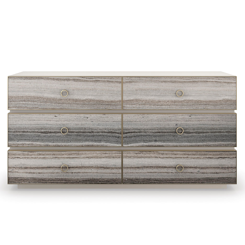 A compelling mix of texture and material, the Caracole Bedrock Dresser brings an organic elegance to bedroom interiors. Crafted from polished gray sandstone with intricate banding and natural color variations, drawer fronts are minimally adorned with metal trim and small ring pulls in Champagne Gold. Balanced on a wood plinth base, its top and sides are finished in a softly contrasting, creamy Almond Milk paint.