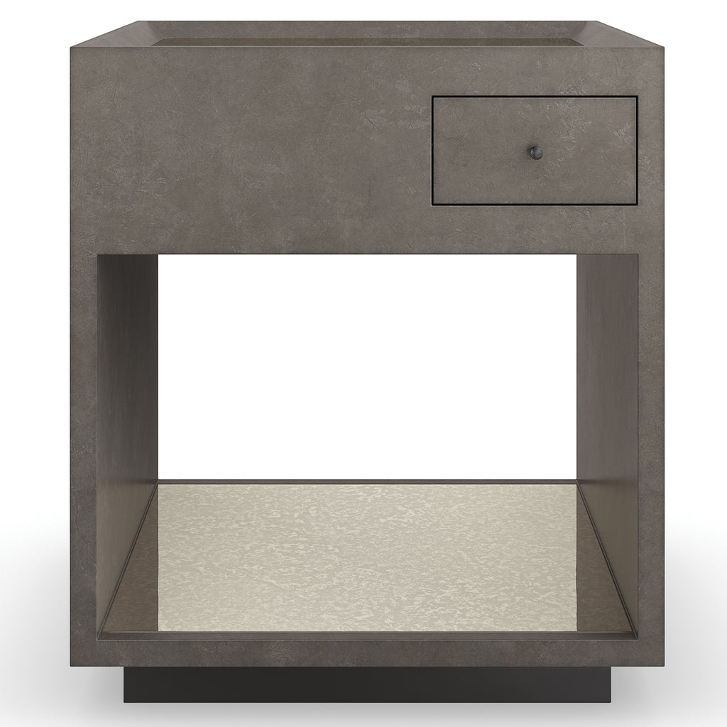 An alluring mix of materials and finishes elevates this end table, featuring a simple square shape and open space for storage and display. An antique mirrored top and shelf creates a sense of depth and warm reflection, complemented by an overall broken leaf finish for tactile appeal and added shimmer. A single, asymmetrical drawer with recessed finger pulls offers a tucked-away place for minimizing clutter.