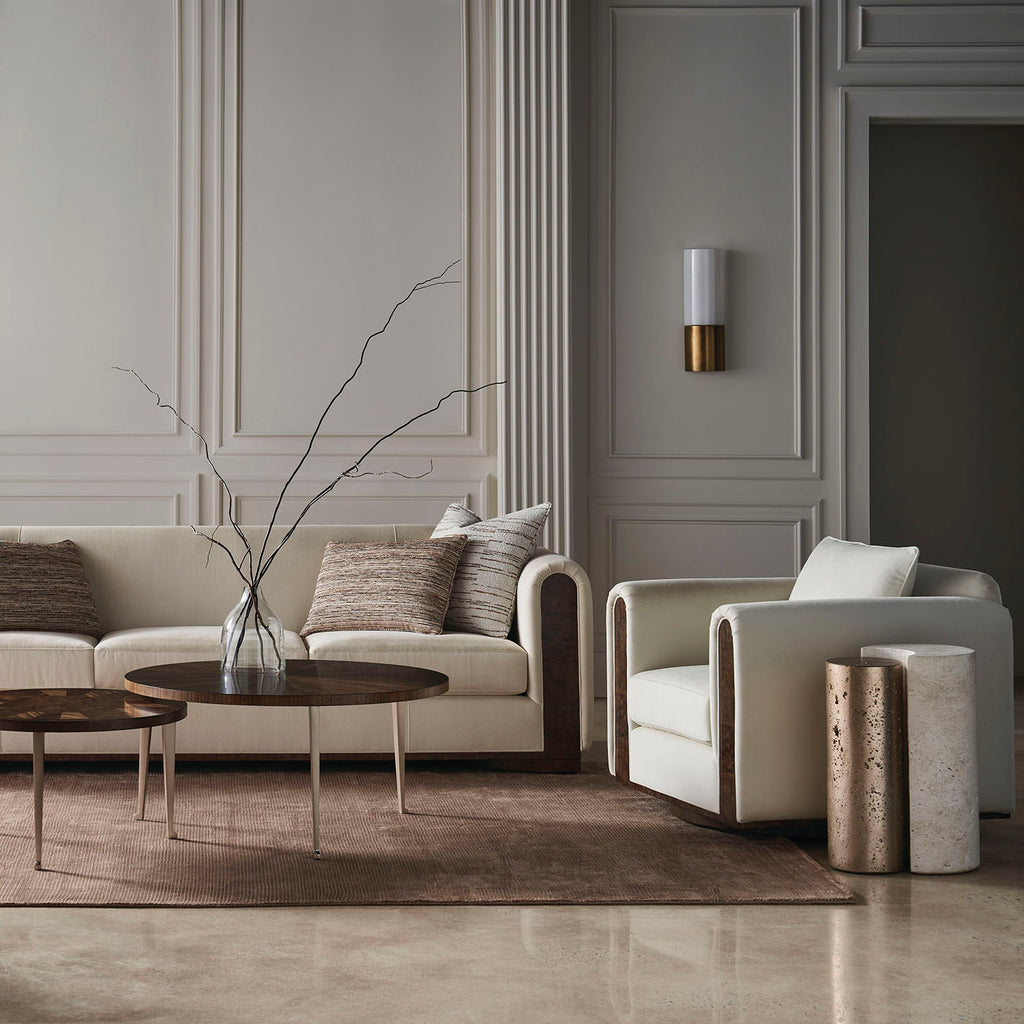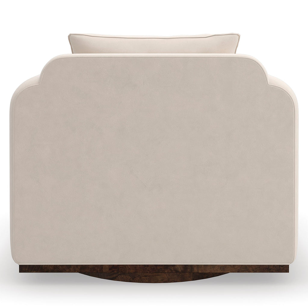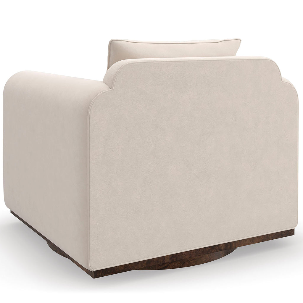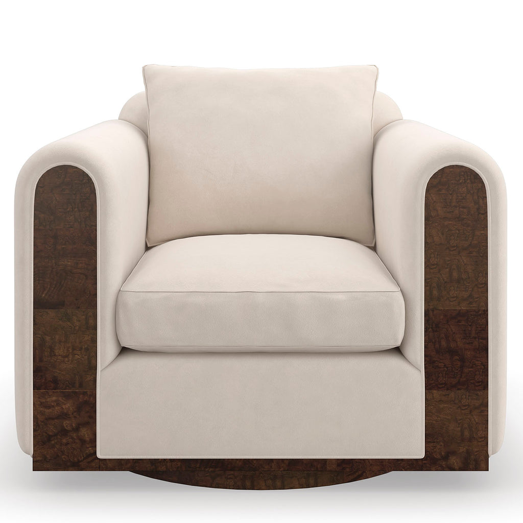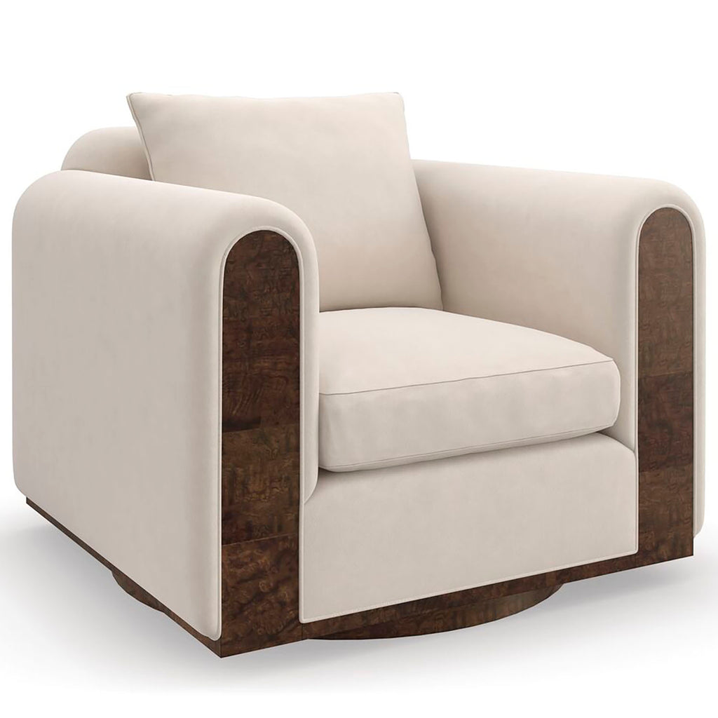 A stand-alone swivel, or companion to our Caracole Dimitri sofa, this generously scaled lounge chair adds a sense of harmony and organic fluidity in an eggshell-colored, faux angora velvet. An inset of Galway Mappa Burl accentuates gently rounded track arms, flowing down and around its circular base.