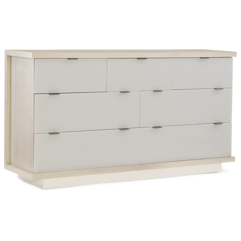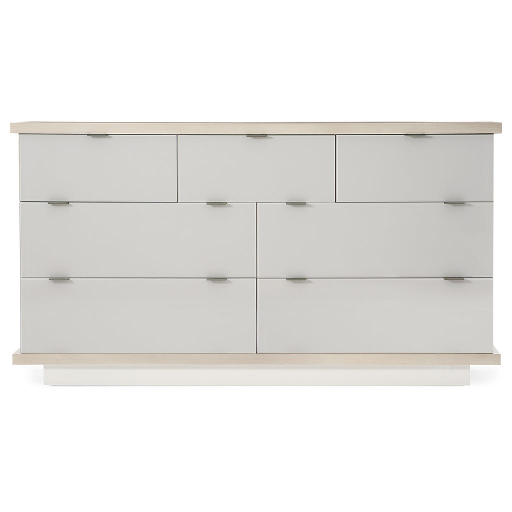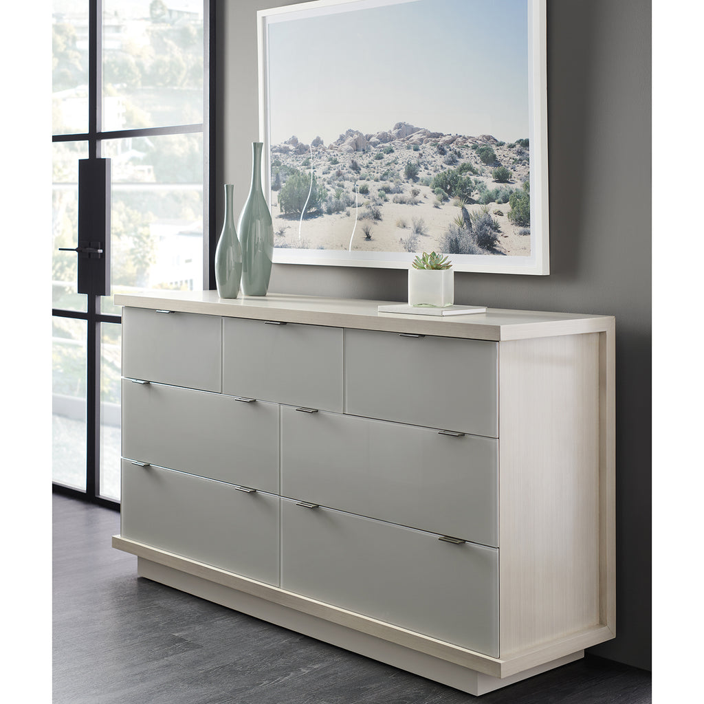 Seven impressive back-painted glass door fronts raise this dresser to the epitome of luxe refinement. The top and sides are finished in Ashe Taupe, a natural complement to the glass drawers painted in a shade of Delicate Gray. Each drawer features a notched glass drawer front with a pull-tab and opens to reveal a fully finished interior in Winter Haze awaiting your favorite wardrobe pieces. Integrated USB ports can be found on either side. Elegant on its own, this dresser is equally adept at playing a starring or supporting role in the room’s design.