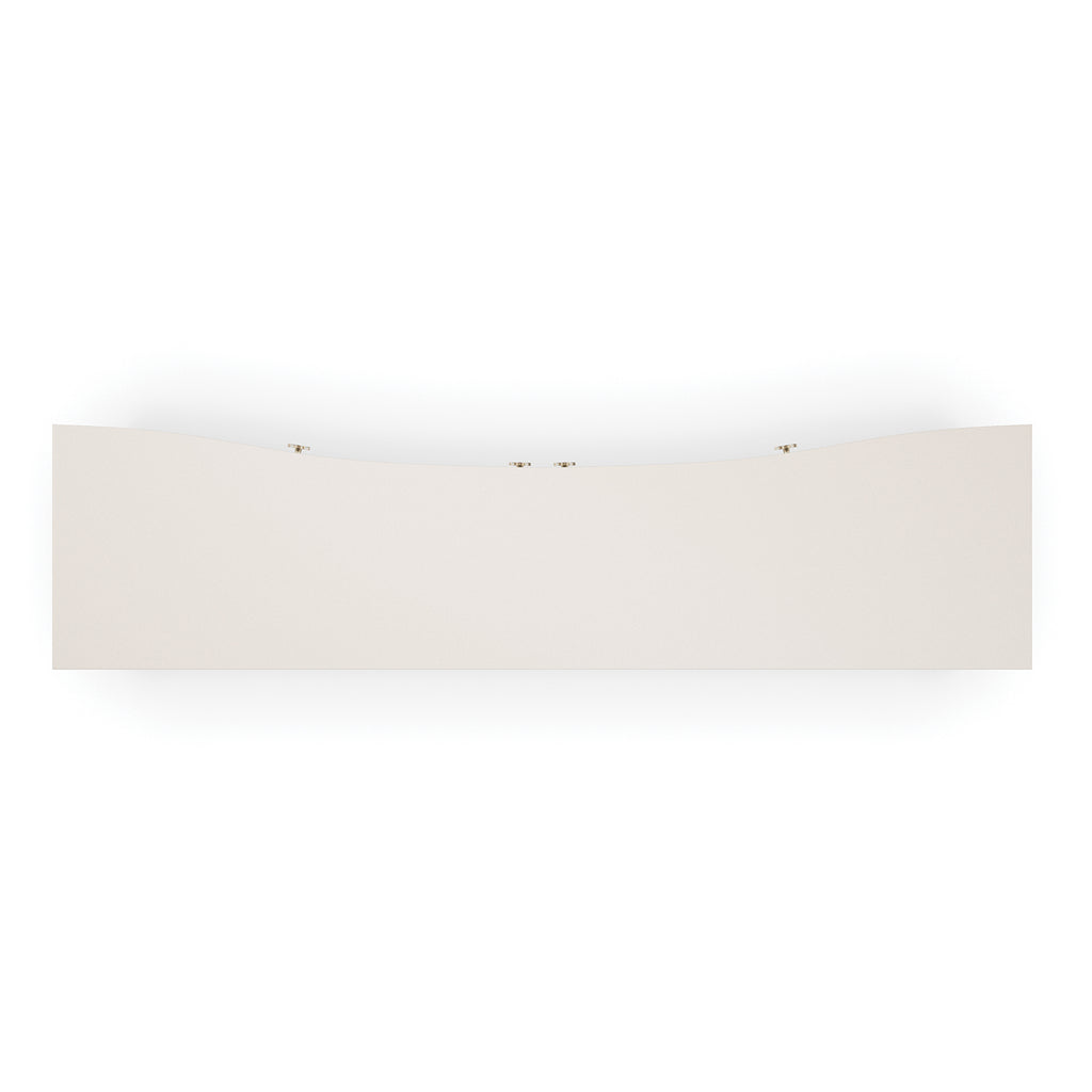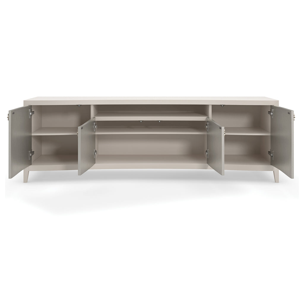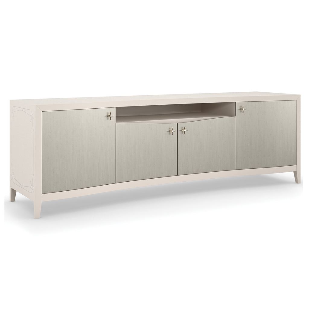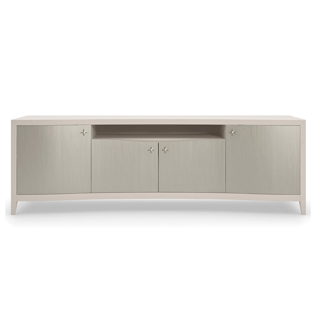 With subtle curves complemented by soft silver tones, this media console makes a charming addition to any interior. A matte pearl finish gives light to the natural beauty of maple veneer, artfully accentuated by painted door fronts in Silver Charm. Adding a note of distinction: end panels screen printed with a pinstripe design and jewelry-like hardware in a stylized star shape. Features abundant storage potential with adjustable shelves and cutouts in the back for wire management.