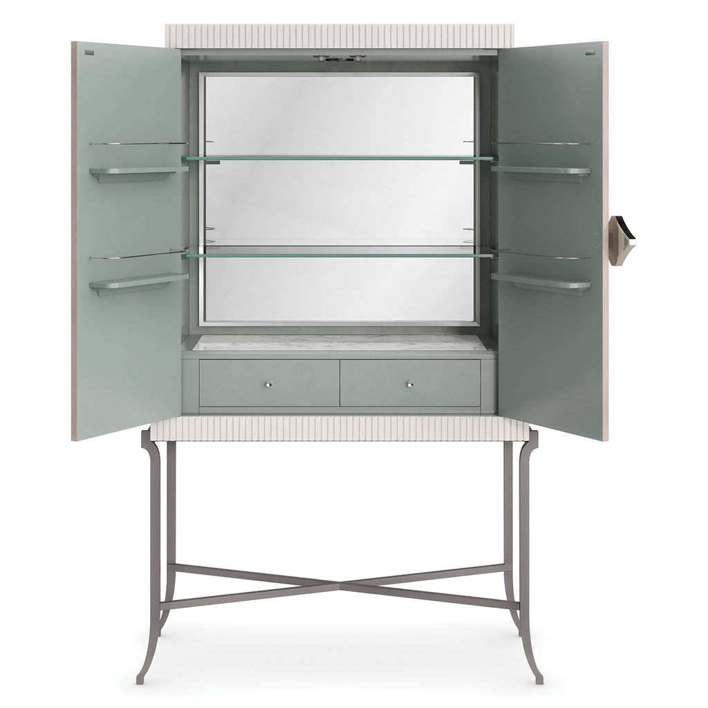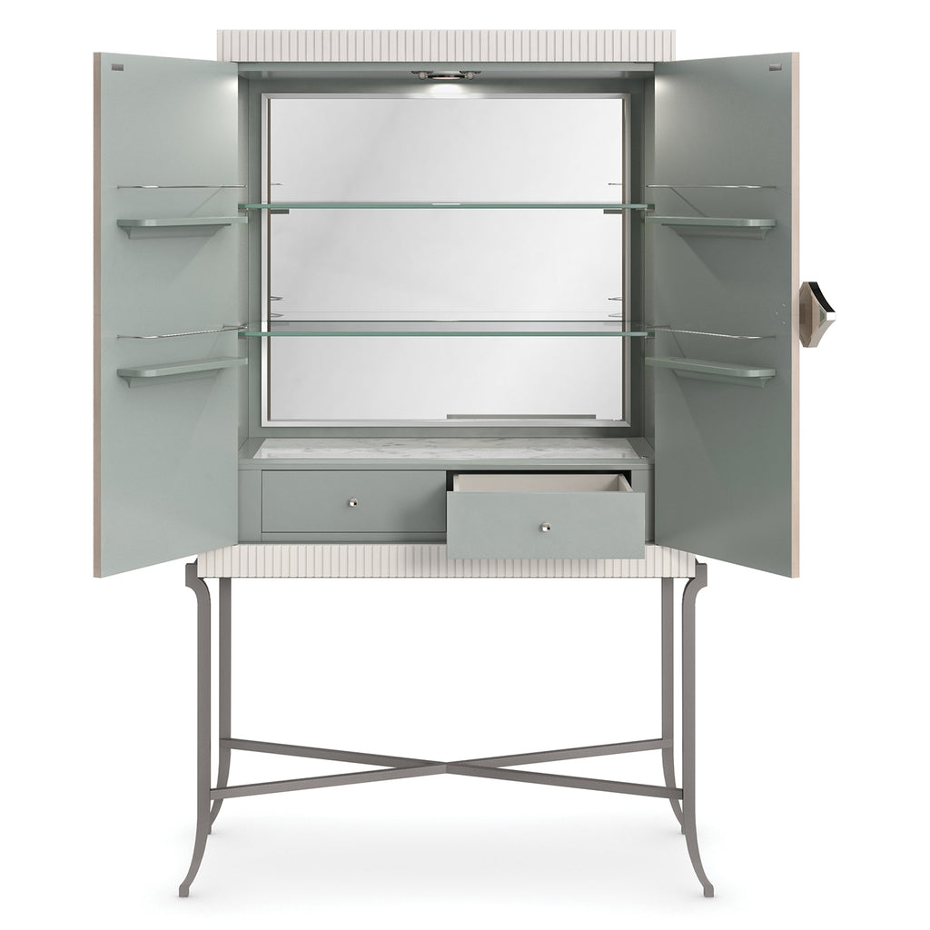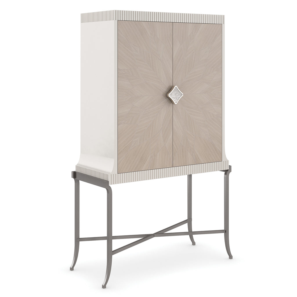 Radiating beauty, both inside and out, this fashion-inspired bar cabinet makes an alluring addition to living and dining interiors. Balanced on a slender metal frame, it features tall doors exquisitely crafted in Koto veneers to create a romantic rosette pattern, artfully accentuated by a beaded wood detail in Pearly White paint. Adding to its lustrous Moonstone finish, Majestic Gold hardware with a cracked acrylic inset lends a sparkling focal feature. Its pale blue painted interior features LED lighting with a touch dimmer, a mirrored back panel, and ample storage for entertaining essentials. A scratch- and stain-resistant Sintered stone surface allows you to mix cocktails and mocktails worry free.