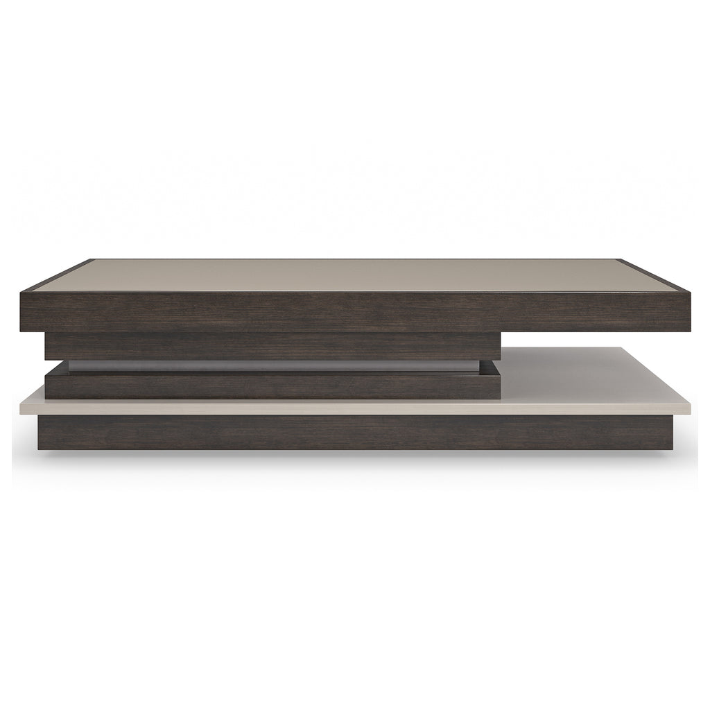 Balancing beauty and functionality, this tiered cocktail table builds on basic principles of design and architecture. Stacked slabs in a mix of materials and finishes lend structure and integrity, with alluring details like a frosted bronze glass top and metal trim in Smoked Stainless Steel paint. Features hidden casters for ease of movement.