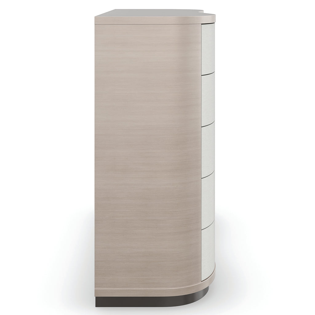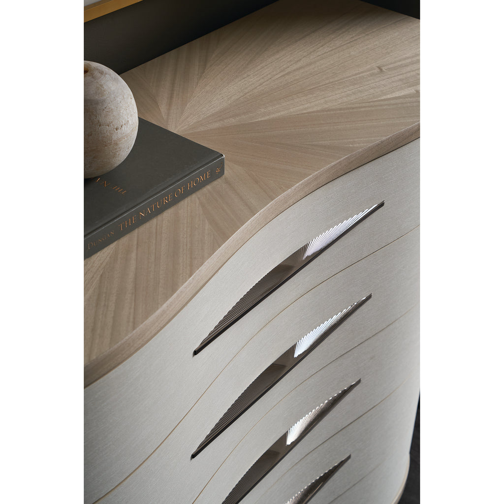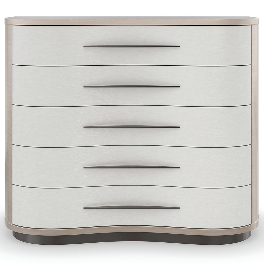 Free-flowing in nature, this sinuously shaped dresser makes a simple, yet elegant, organic statement. Vinyl-wrapped drawer fronts accentuate its gentle curvature and offer subtle contrast to Koto veneers in a pearlescent Moonstone finish. Five soft-close drawers offer tucked-away storage, with horizontal hardware and painted interiors for an unexpected finishing touch. A removable tray in the top drawer neatly keeps jewelry, trinkets, and cufflinks.