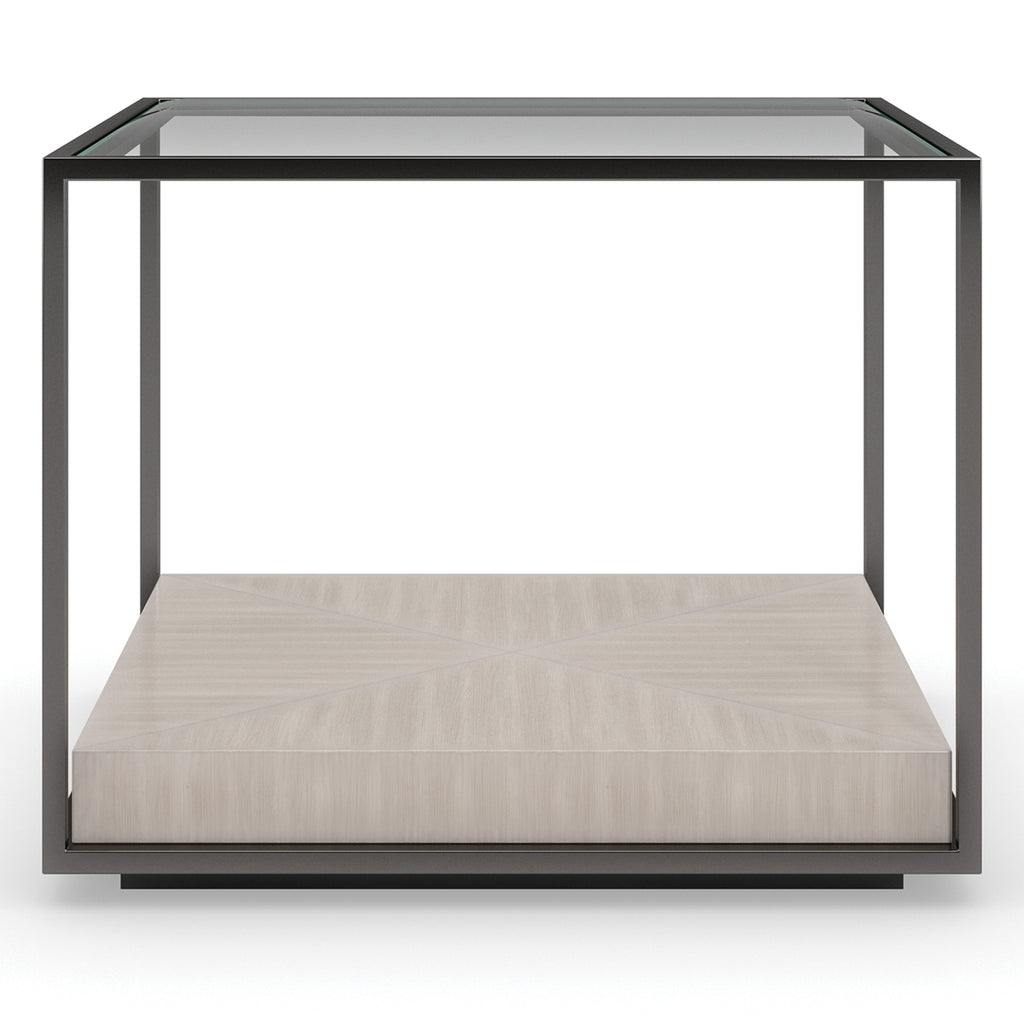 Bunched or single, this architectural design lets you create an ever-changing cocktail table that’s open to interpretation. Framed in Deep Bronze metal, a butcher block shelf in a pearlescent Moonstone finish illuminates the linear grain of Koto veneers. Topped in glass with a beveled edge, it’s visually light, with an elevated, casual style. Pair with our Solid Ground cocktail table, wrapped in faux shagreen, to create a multi-dimensional, layered collection with luxe appeal.