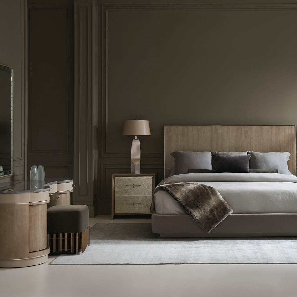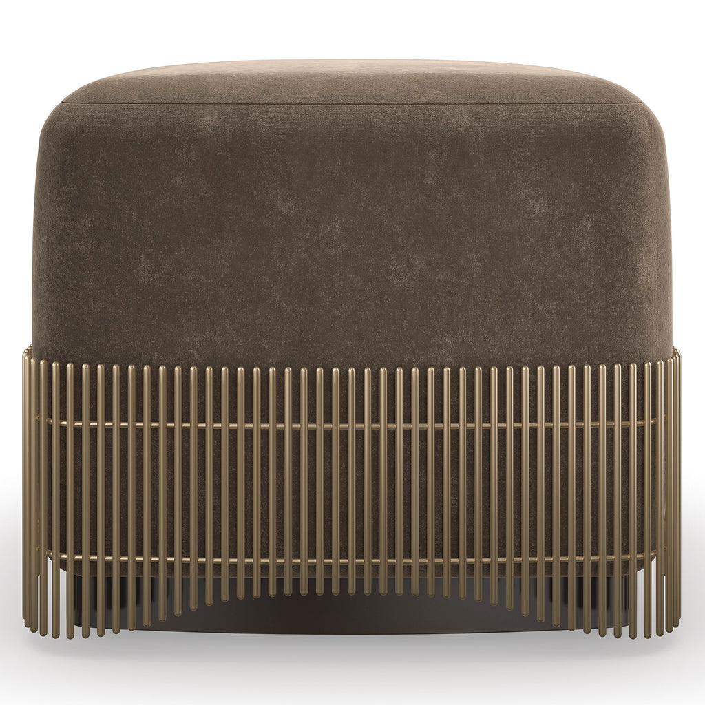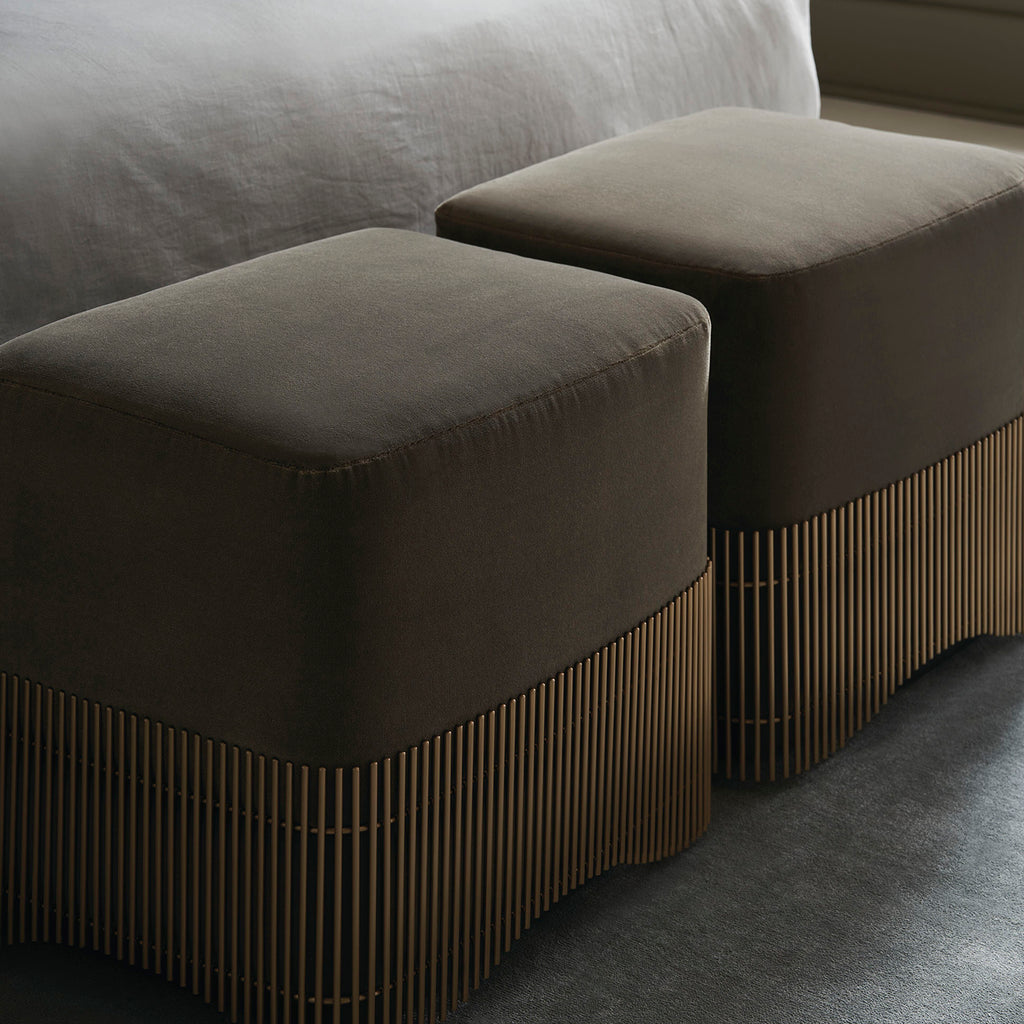 Luxury in a small package, this petite ottoman introduces a sense of rhythm and fluidity to living and bedroom interiors. Moss-green mohair is warmly complemented by a uniquely designed, metal rod skirt in Brushed Gold, introducing a gentle wave pattern that gives just a glimpse of its wood plinth base. Hidden casters make it easy to move from room to room. Well-scaled for vanities and dressing areas, or style in pairs to create a luxe landing at the end of a bed.